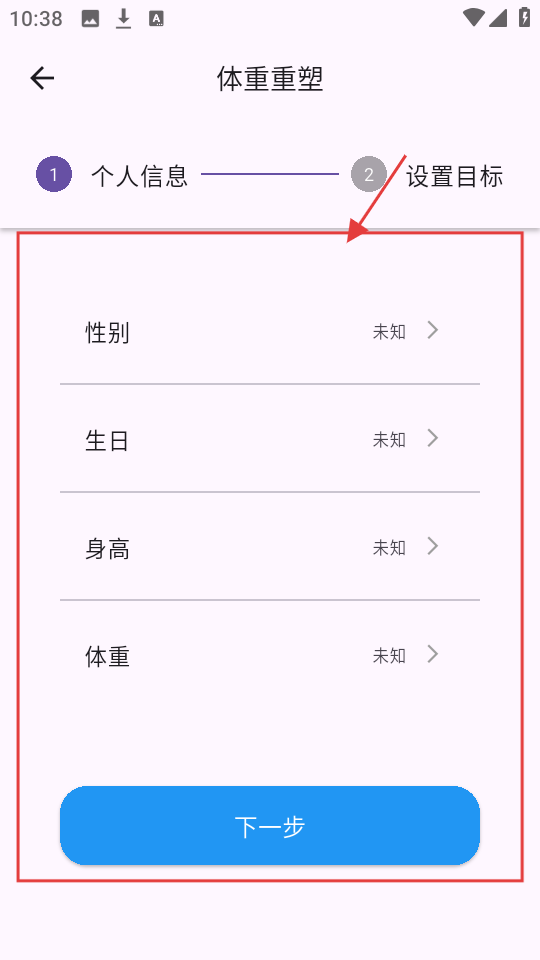 4、进入体重重塑页,依次填写性别、生日、身高、体重等信息,再点【下一步】进行重塑即可。