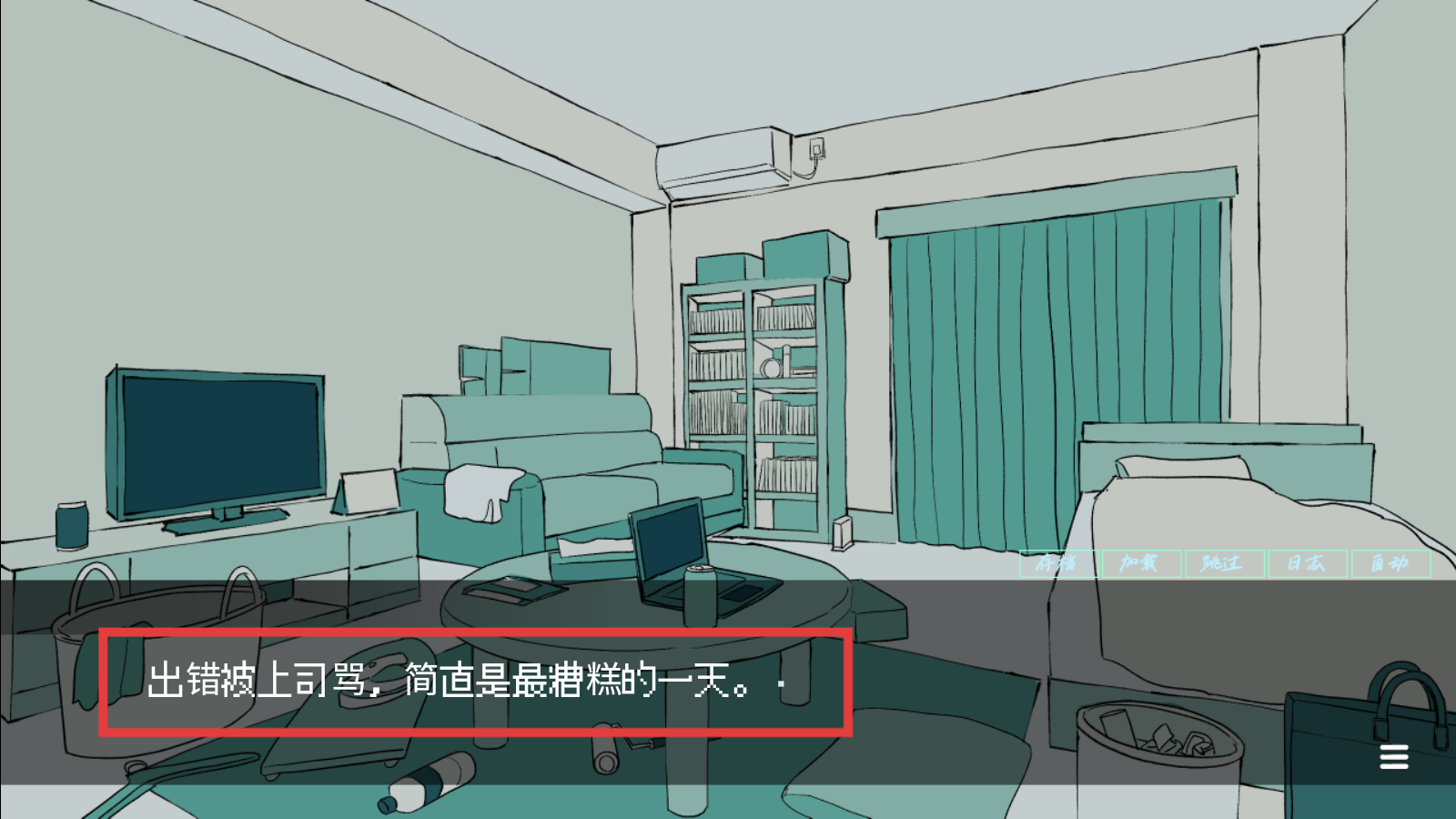 2、在室内场景中,关注底部剧情文字【出错被上司骂-简直是最糟糕的一天。】,借助这段剧情更好地代入角色,理解当前处境。