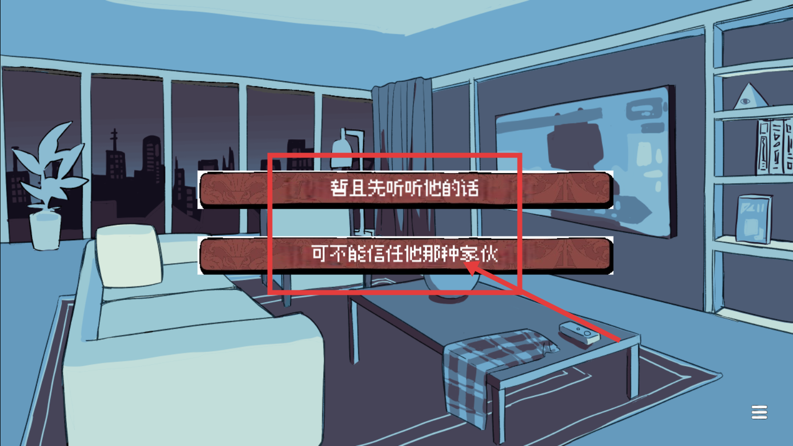 3、遇到选择分支时,根据对剧情的判断,选择【暂且先听听他的话】或【可不能信任他那种家伙】,不同选择会引导不同的剧情发展。