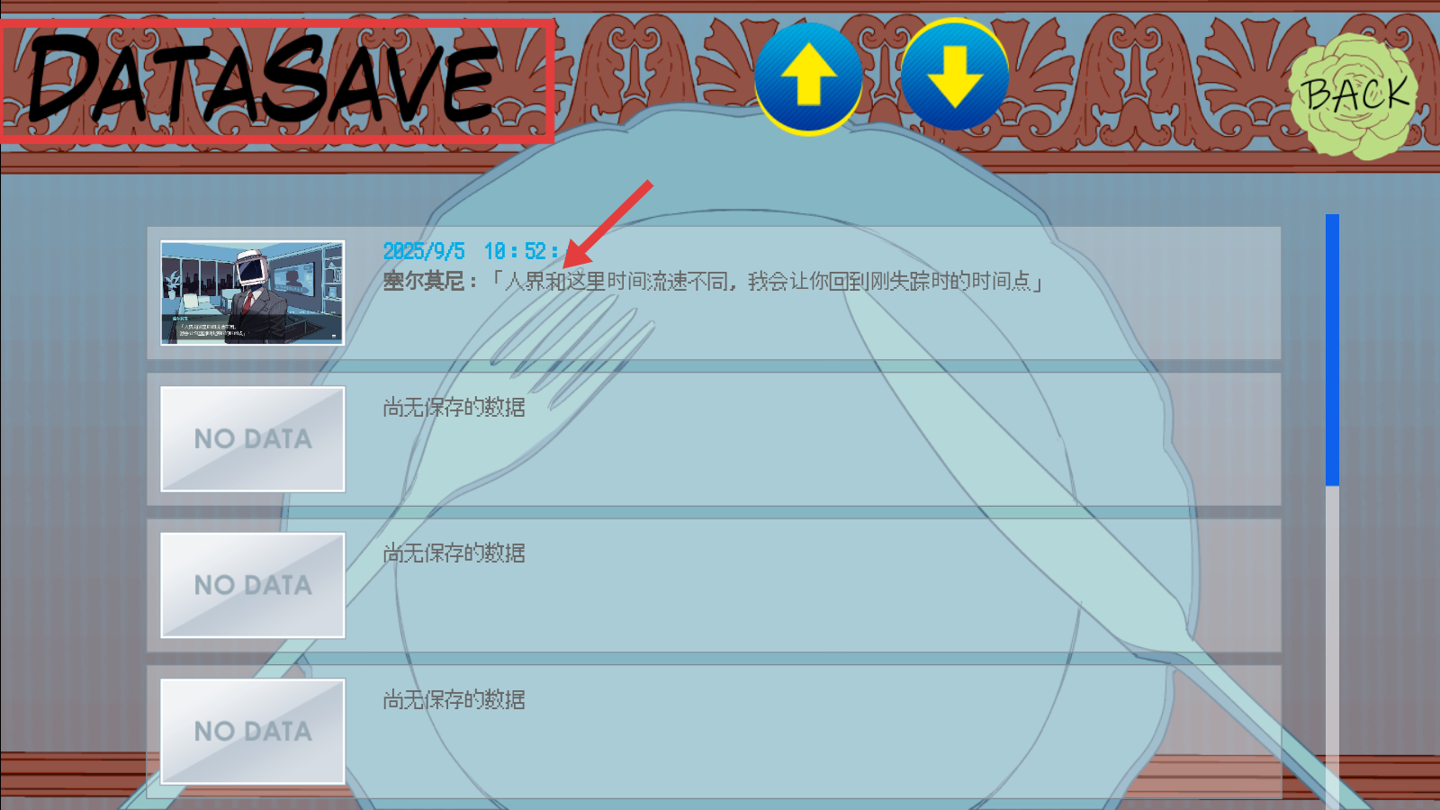 4、可进入【DATASAVE】界面,查看保存的数据,还能利用塞尔其尼的提示,回溯关键时间点推进游戏。