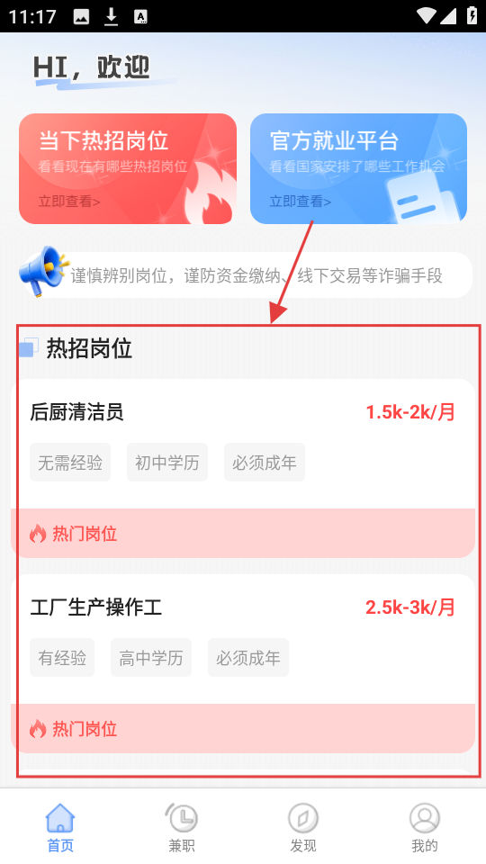 1、进入首页,浏览后厨清洁员、工厂生产操作工等热招岗位,了解薪资及要求。