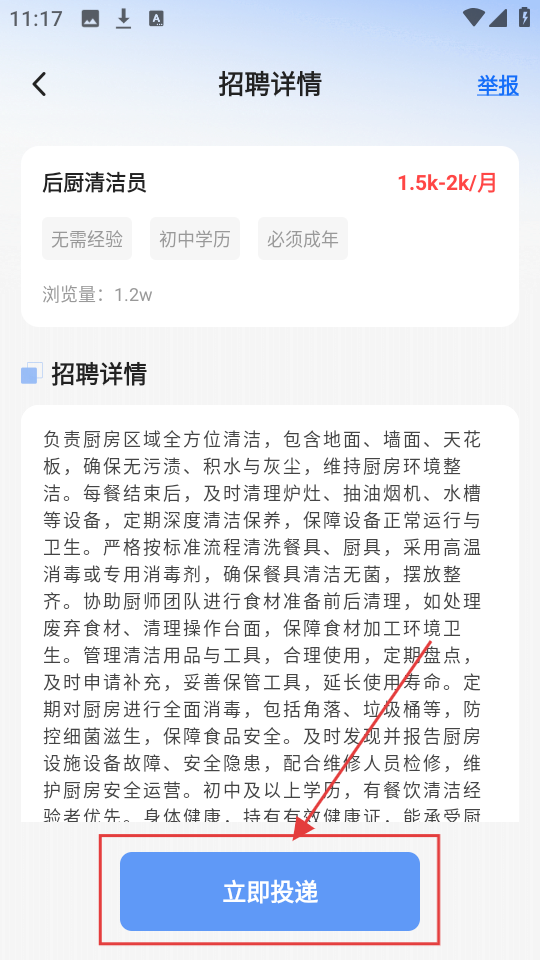 2、选中心仪岗位如后厨清洁员,查看招聘详情后,点击【立即投递】,进入投递流程。