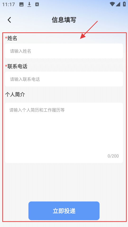 3、在信息填写页,输入姓名、联系电话,补充个人简介,完成后点【立即投递】。