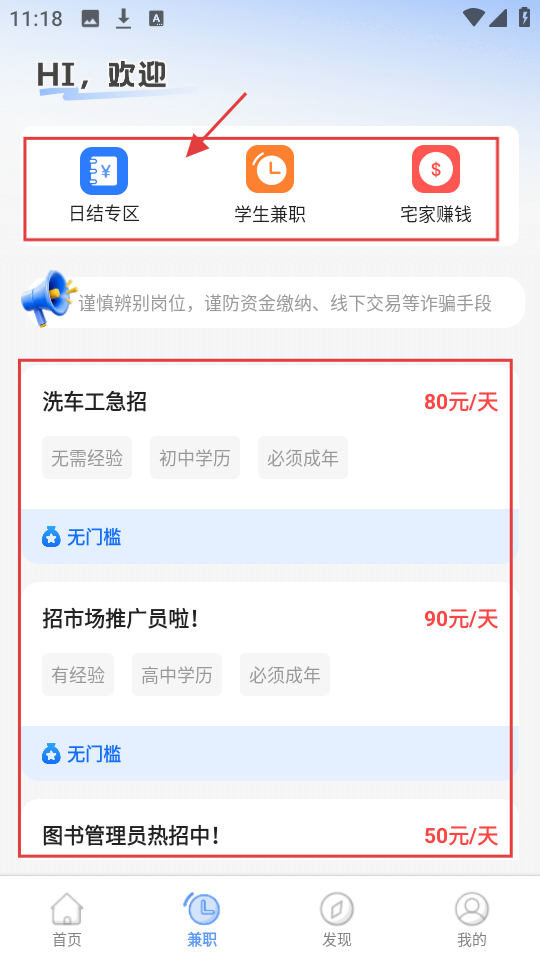 4、切换到兼职页,可从日结专区、学生兼职等分类里选,浏览洗车工、市场推广员等岗位。