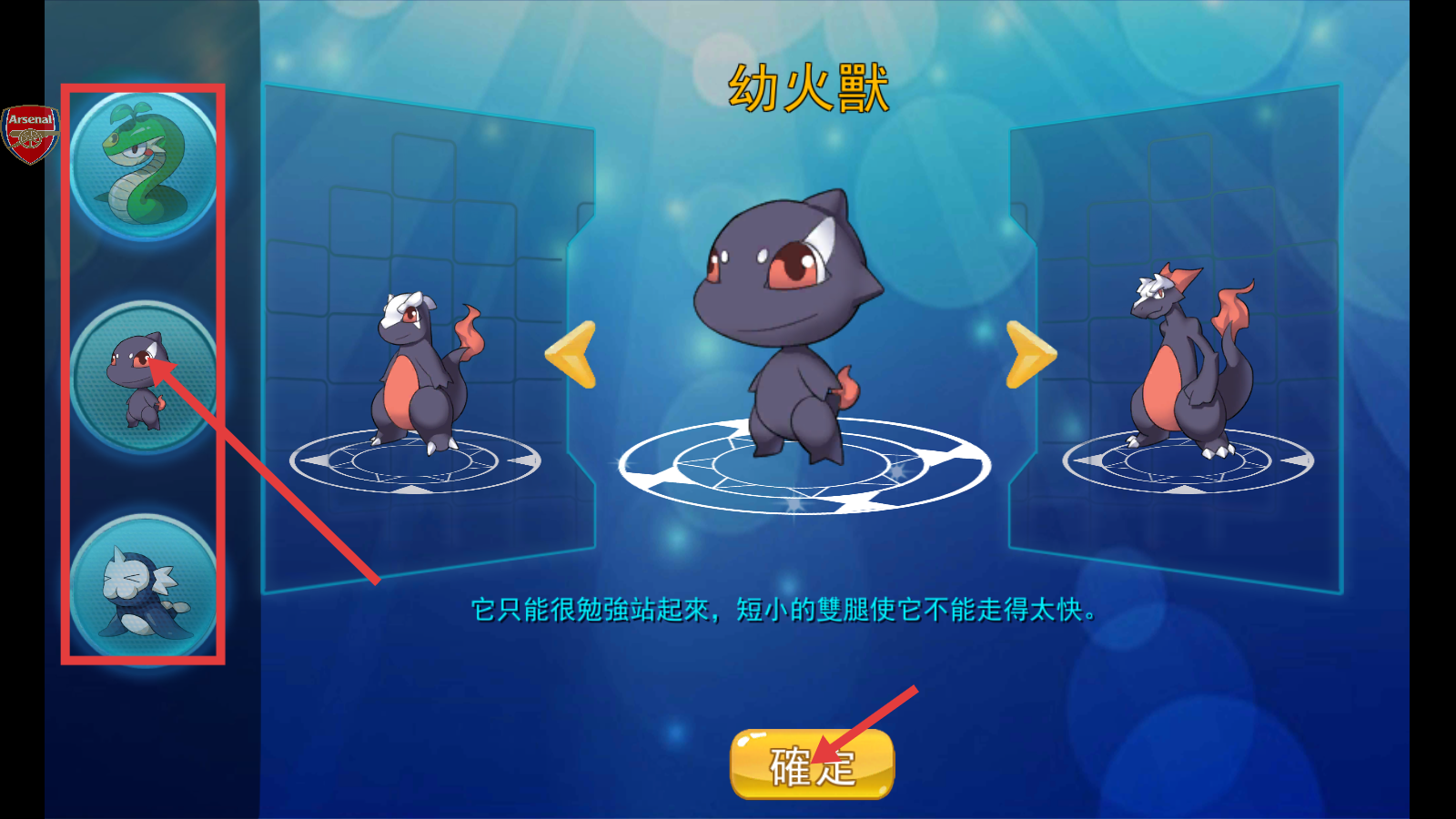 2、在精灵选择界面,可挑选【幼火獸】等精灵,点击【確定】选择该精灵。
