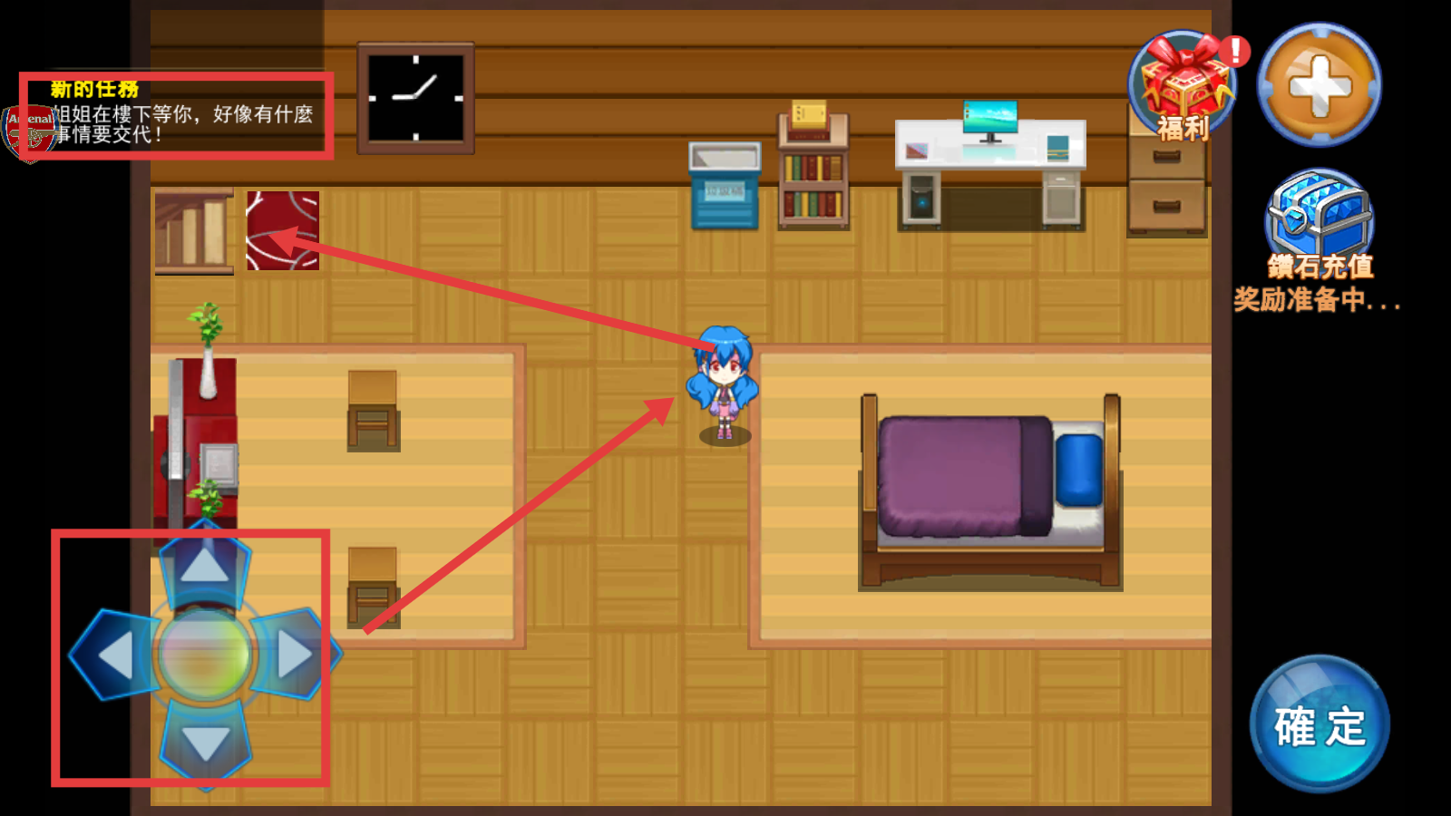 3、接到“姐姐在楼下等你,好像有什麼事情要交代”的新任务时,使用左下角方向键操控角色移动,前往指定位置找姐姐。