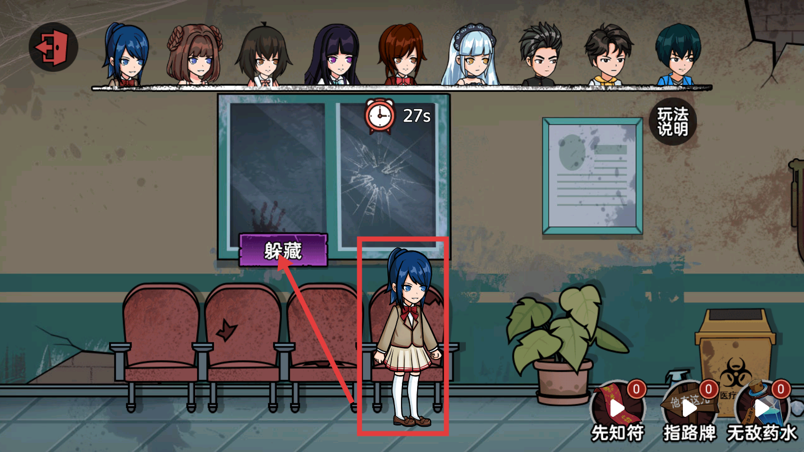 2、在躲藏准备的倒计时内,快速寻找合适的隐蔽位置,点击【躲藏】按钮,让角色进入隐藏状态。