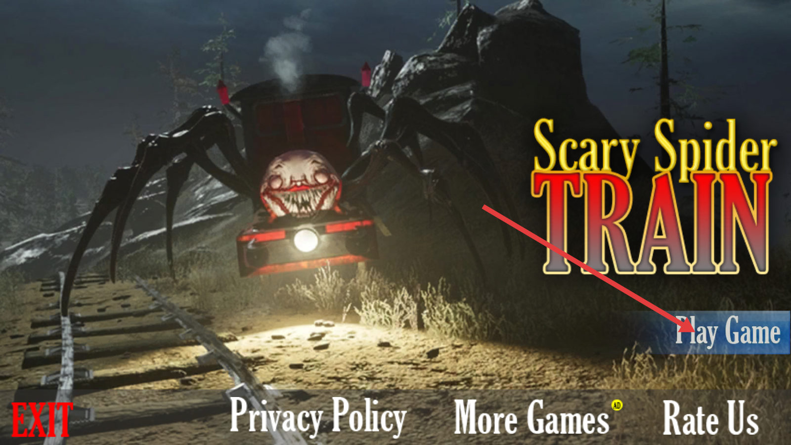 1、打开【Scary-Spider-Train】游戏,点击【Play-Game】按钮,进入恐怖蜘蛛火车主题的冒险场景。