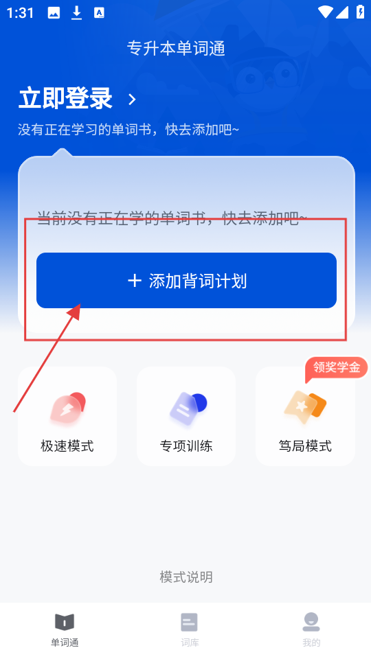 1、进入专升本单词通,点【+添加背词计划】,还能选极速模式、专项训练等,开启背词。