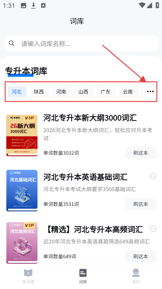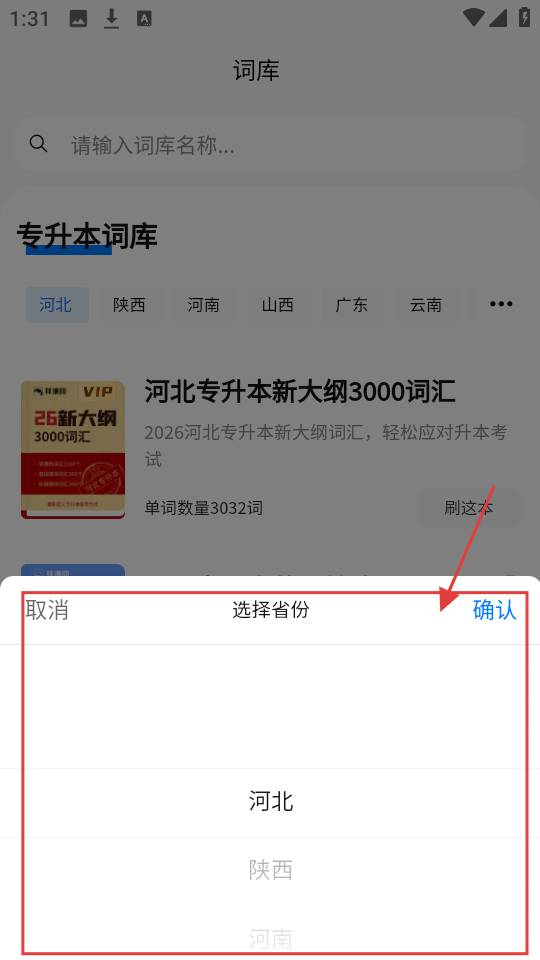 2、切换到词库页,可搜索词库,也能选河北、陕西等省份,查看对应专升本词库。