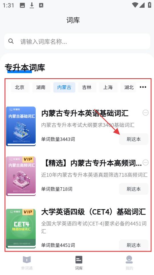 4、选好省份如内蒙古后,浏览该省份的专升本词库,点【刷这本】,开始背对应的单词。