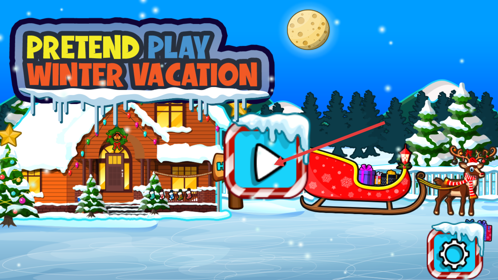 1、打开【Pretend-Play-Winter-Vacation】游戏,点击带有播放图标的按钮,进入冬季假期主题的模拟场景。