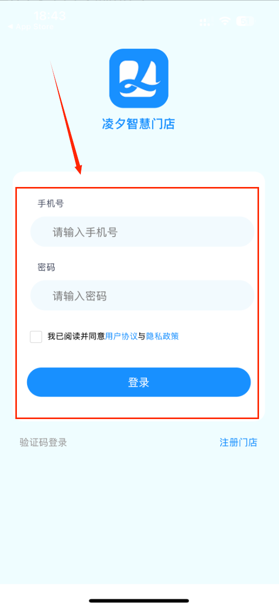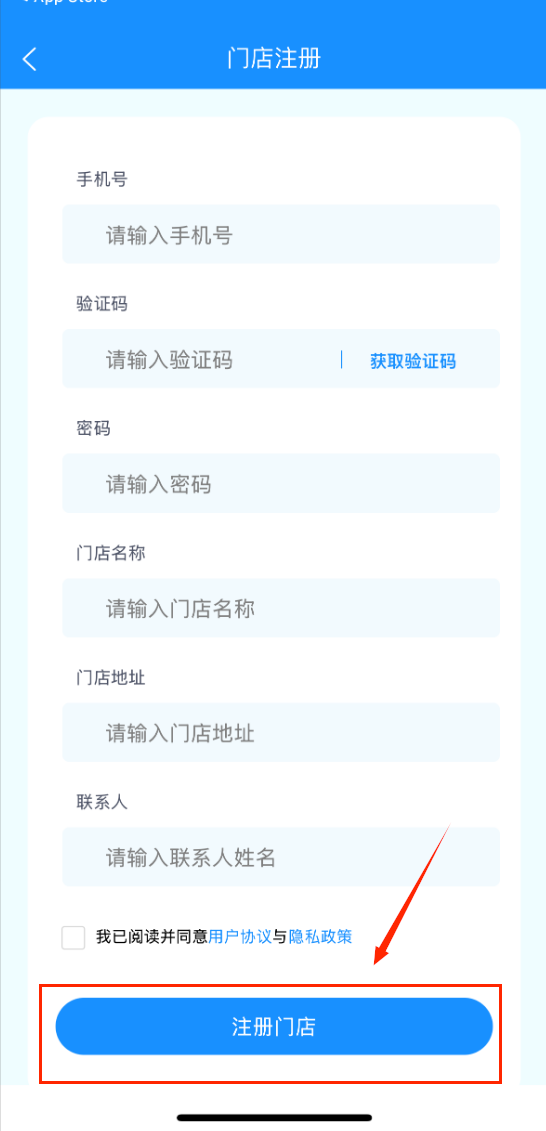 2、如果是第一次使用需要先注册门店账号,点击登录页底部的注册门店选项,依次填写手机号、验证码、密码和门店基本信息。