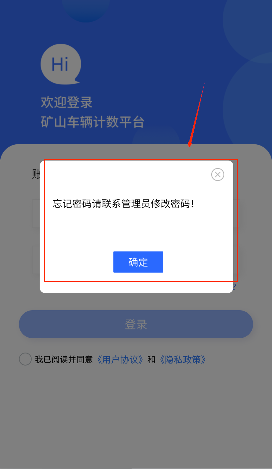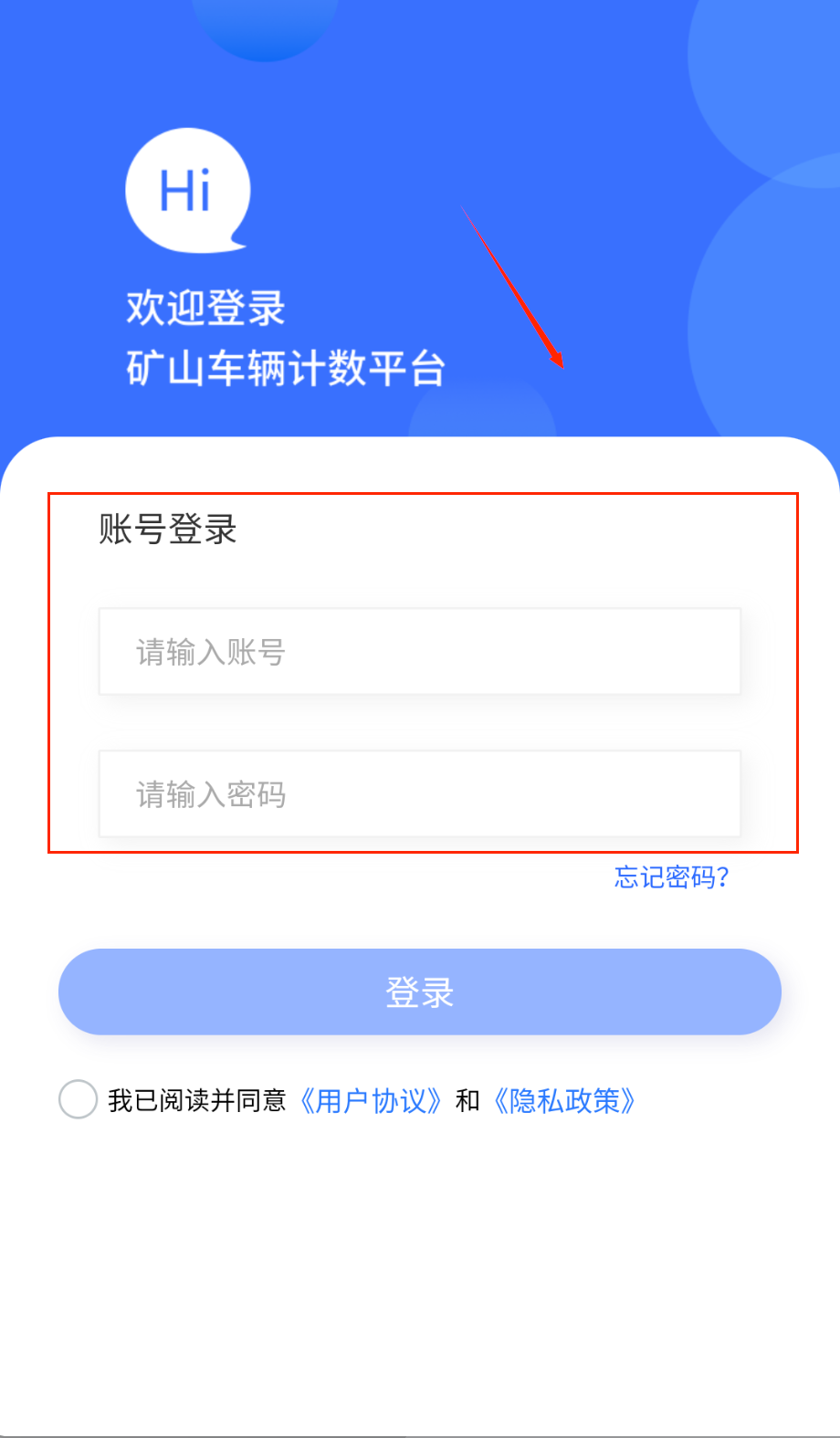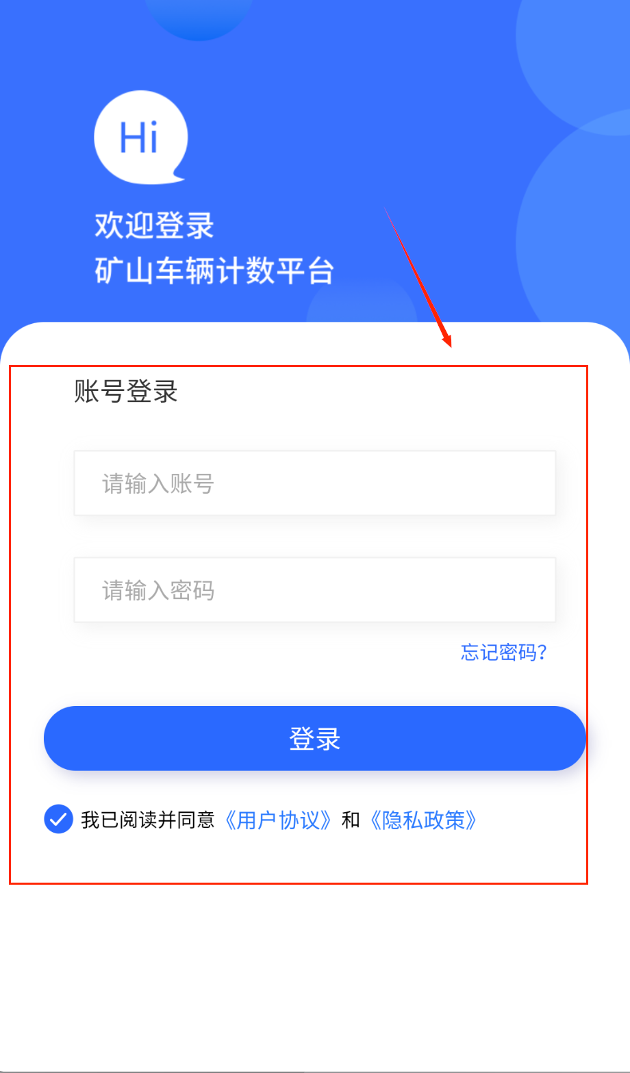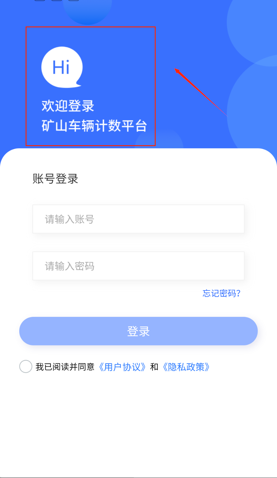 1、打开软件就能看到蓝色背景的登录界面啦,上方显示着亲切的Hi字样和欢迎登录矿山车辆计数平台的提示语,中间区域有账号密码的输入框。