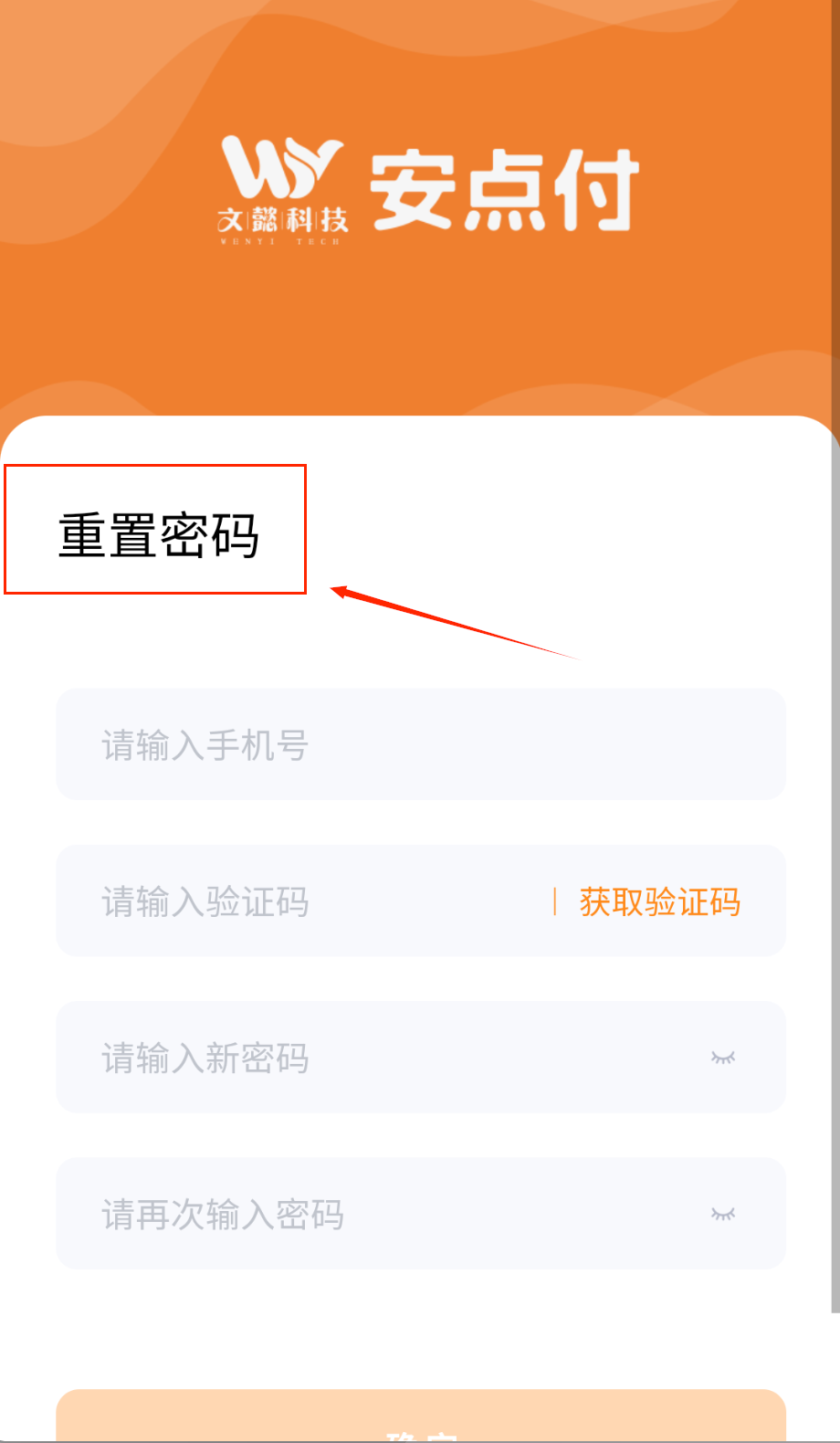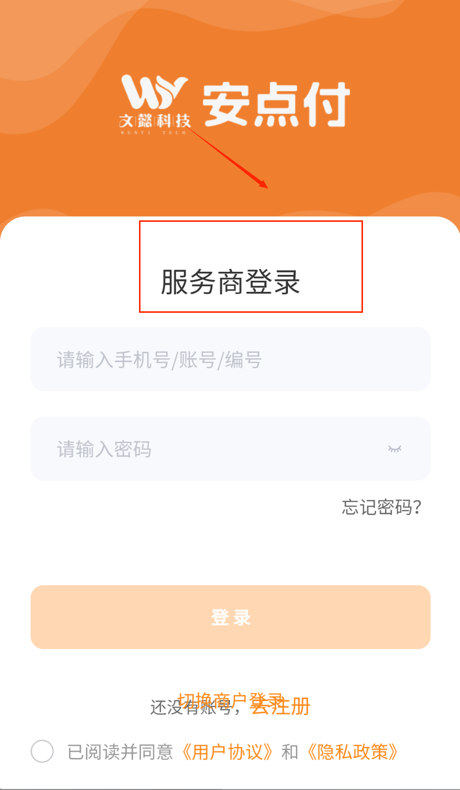 1、打开软件首先看到橙白配色的登录界面,在顶部文懿科技安点付标识下方找到服务商登录选项,输入手机号或账号编号和对应密码。