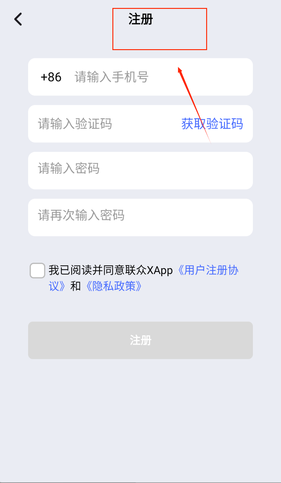 1、打开软件进入注册页面,在手机号输入框准确填写你的号码,点击获取验证码并将收到的数字填入验证码栏。