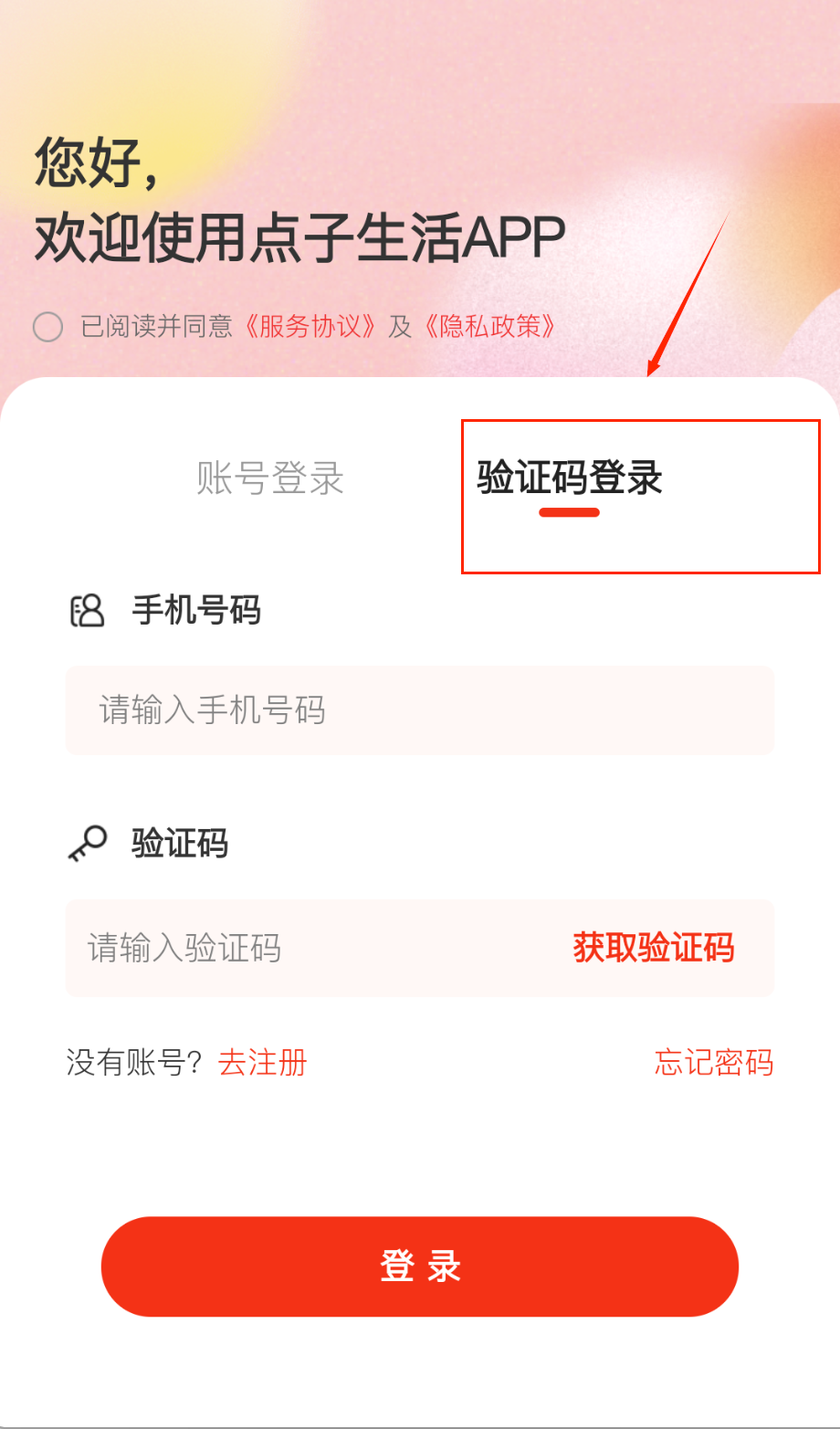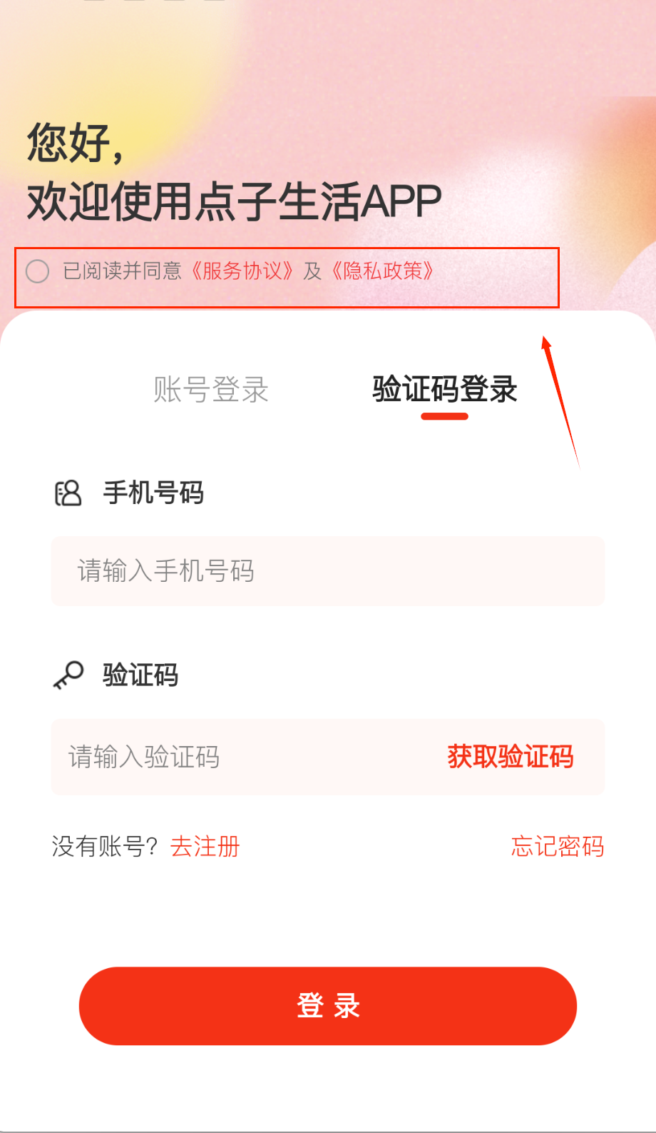 1、打开APP首先看到粉黄渐变色的登录界面,上方显示欢迎语和时间,记得先勾选同意服务协议和隐私政策那个选项框,不然没法进行下一步。
