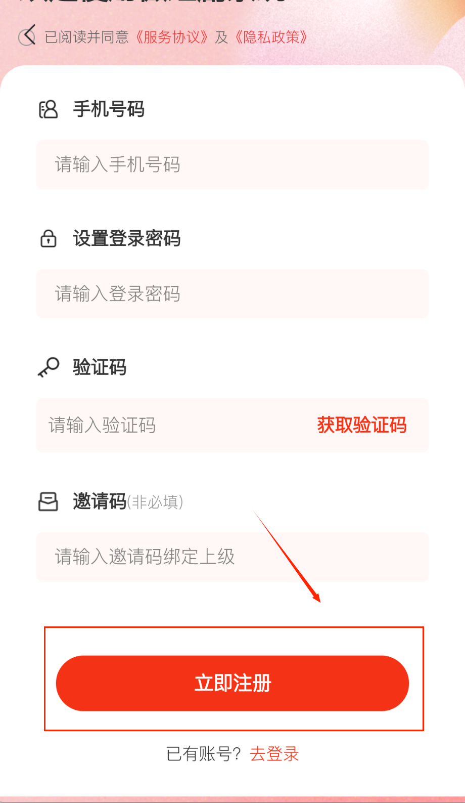 4、没有账号的话点击去注册按钮,按提示填写手机号设置密码,完成注册后就能用新账号登录使用所有功能啦。
