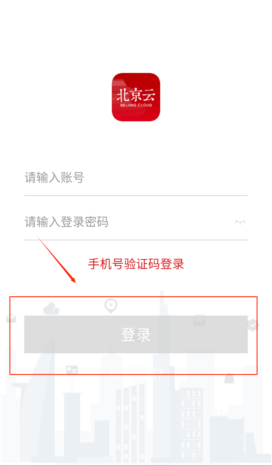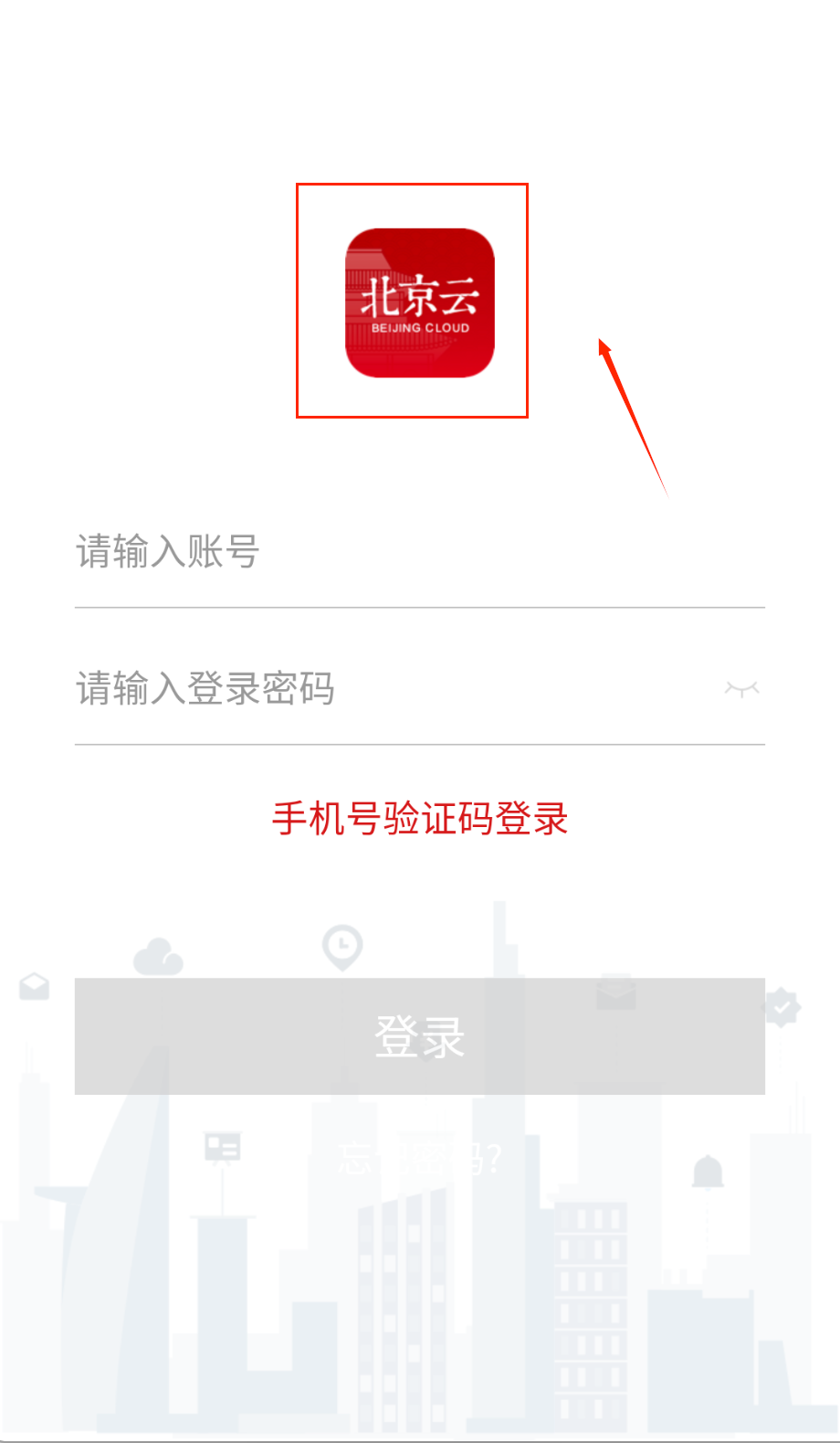 1、打开软件看到简洁的登录界面,上方显示当前时间和信号状态,中间醒目的红色北京云标志下方有两个输入框。