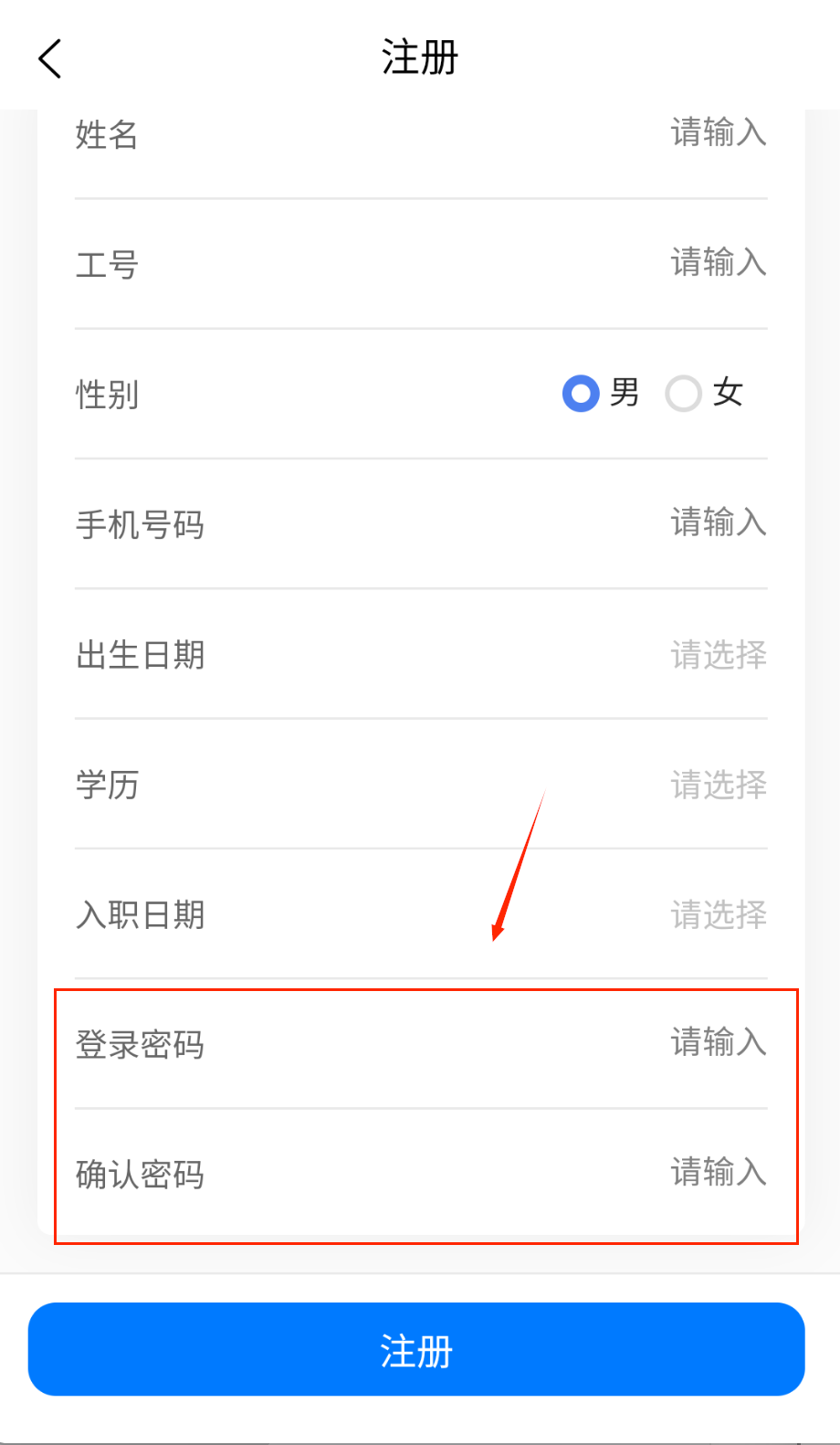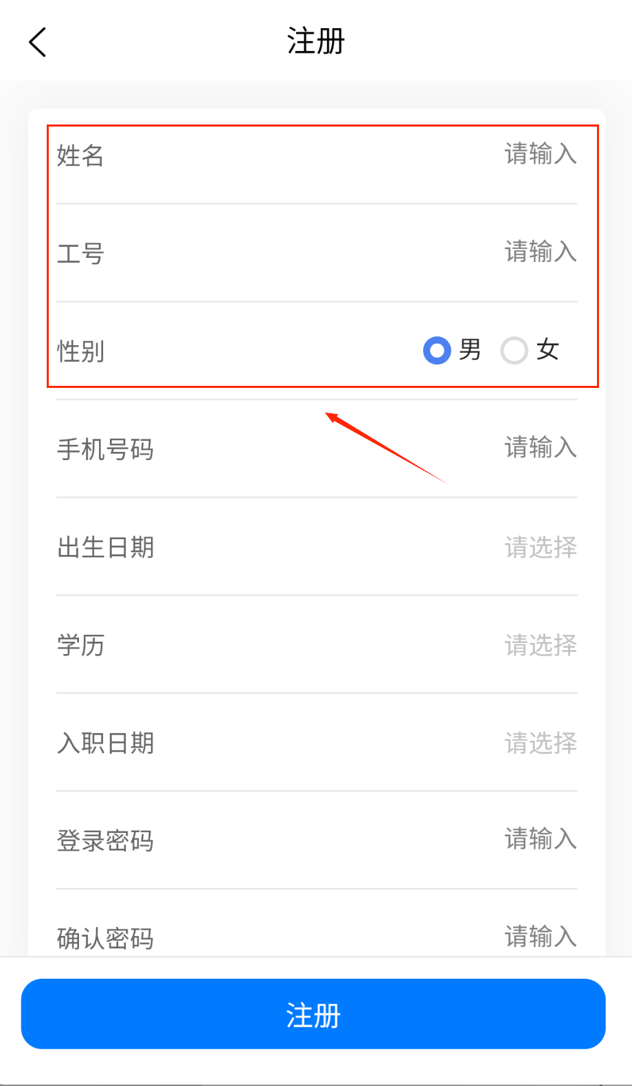 1、打开应用后点击注册账号进入信息填写页面,依次输入姓名、工号和手机号等基本信息,注意性别选项需要手动选择。