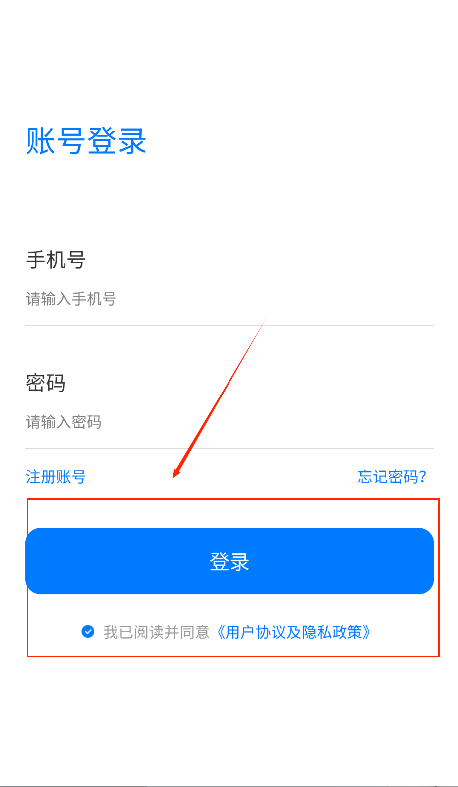3、登录时输入注册的手机号和设置的密码,记得勾选同意用户协议选项,如果忘记密码可以点击忘记密码链接联系上司重置呢。
