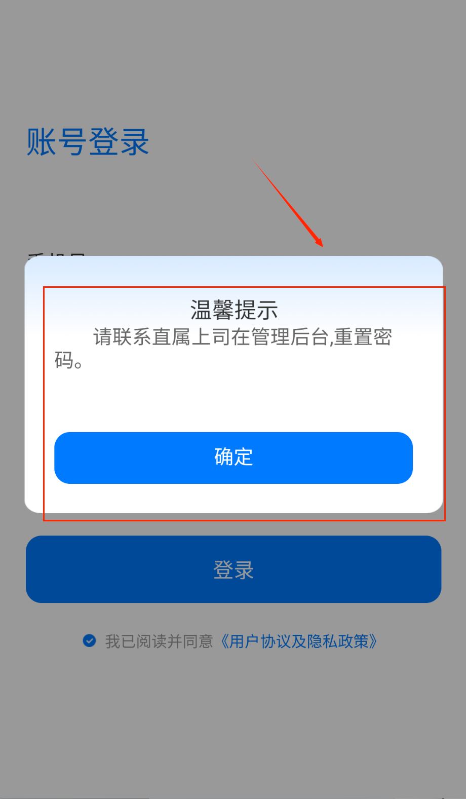 4、遇到登录问题可以查看温馨提示,需要联系直属上司在管理后台重置密码,确定后返回登录页面重新尝试登录操作哦。