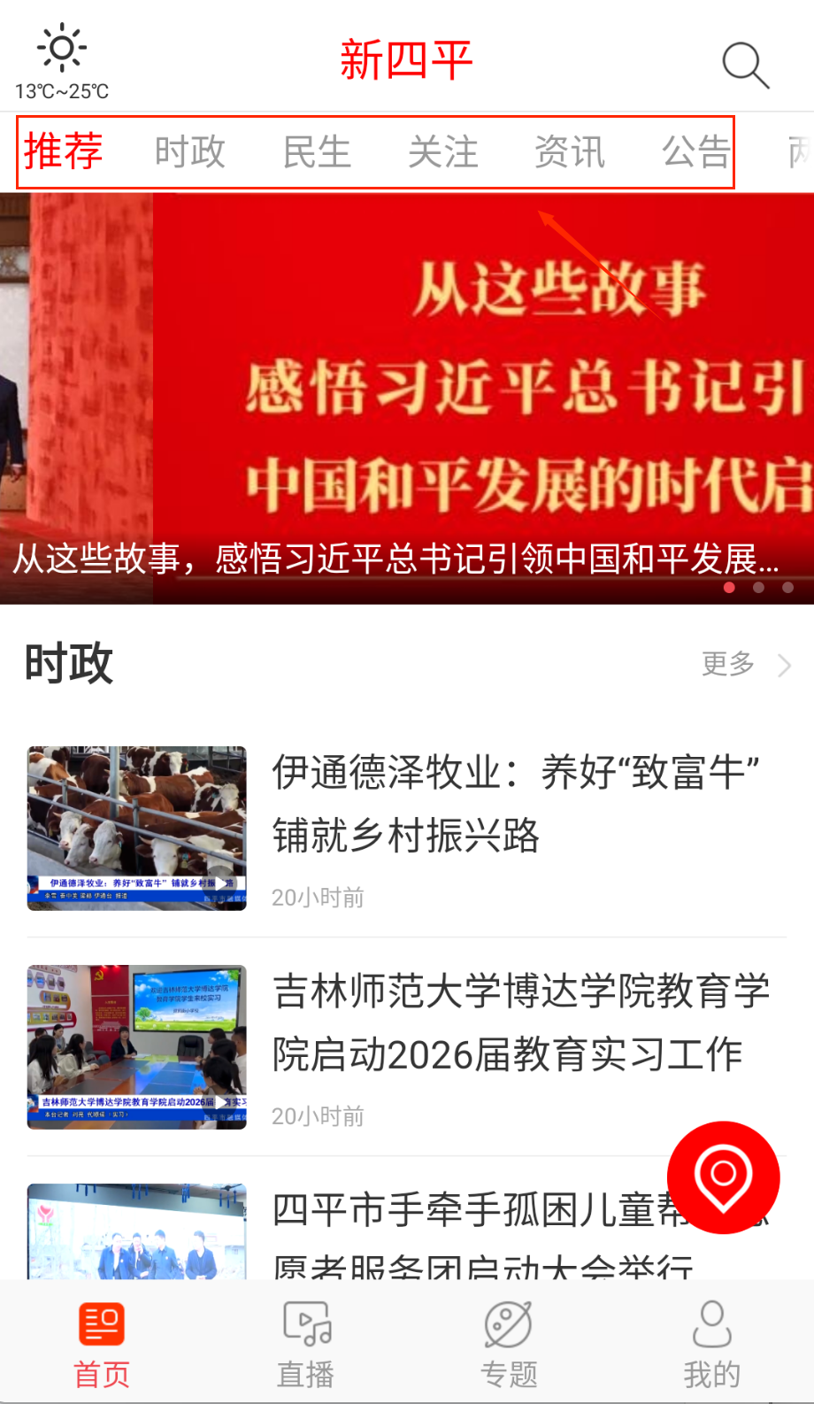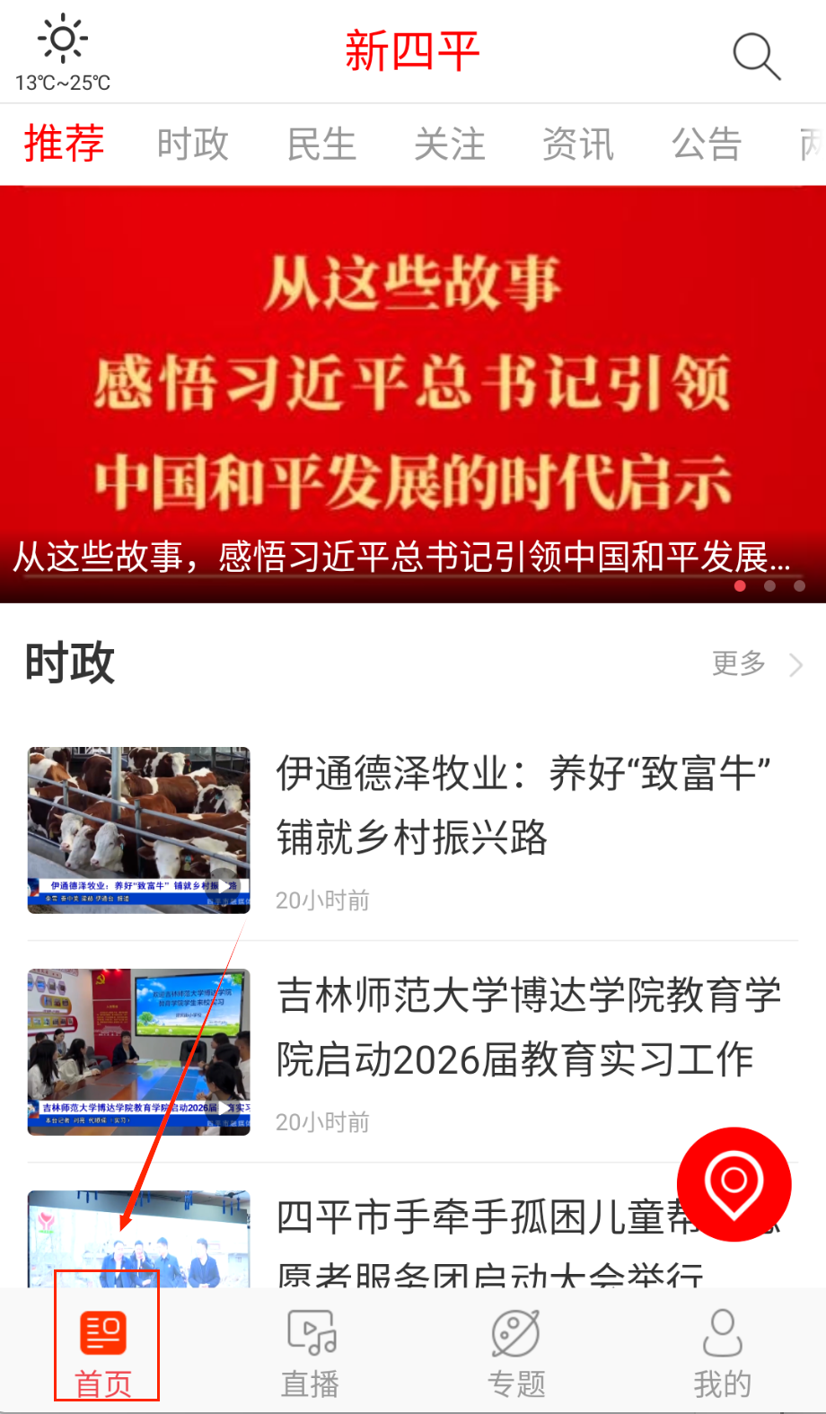 1、打开应用后首先浏览首页推荐的本地新闻内容,系统会根据你的地理位置优先展示四平本地的热点新闻,获取更精准的内容推送呢。