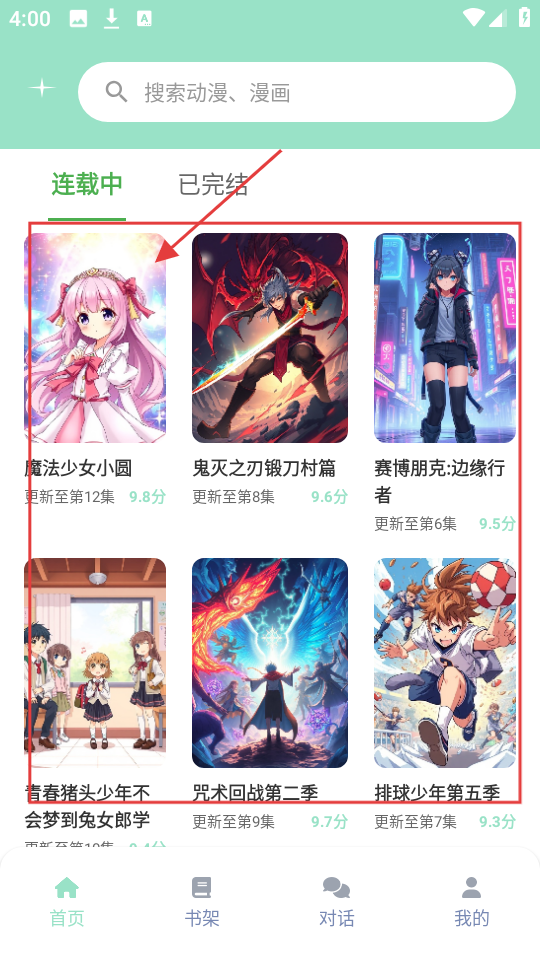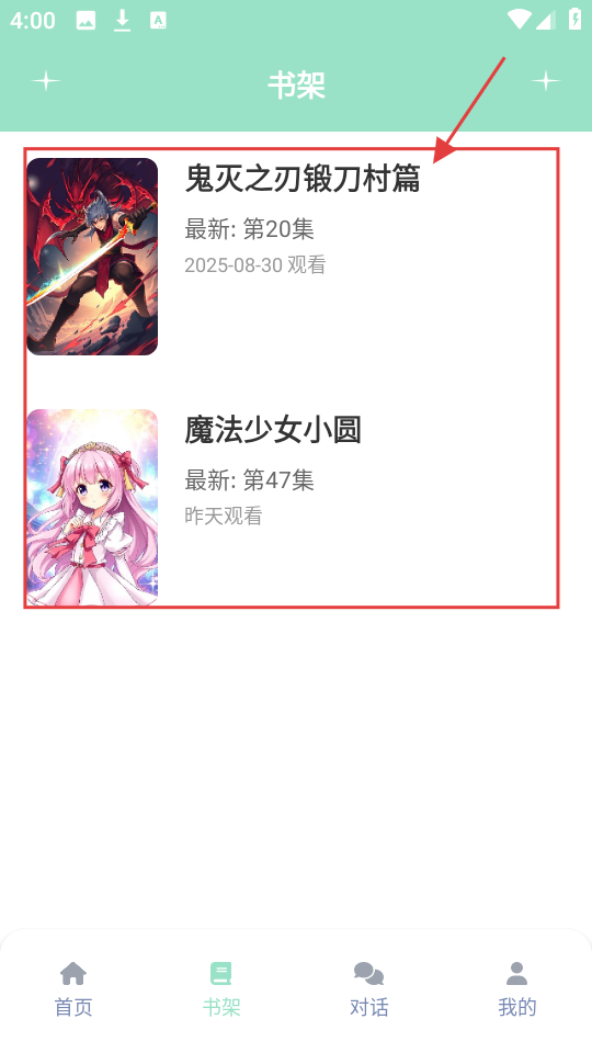 3、切换到书架页,可看已加入书架的动漫,如【鬼灭之刃锻刀村篇】【魔法少女小圆】,直接选看。