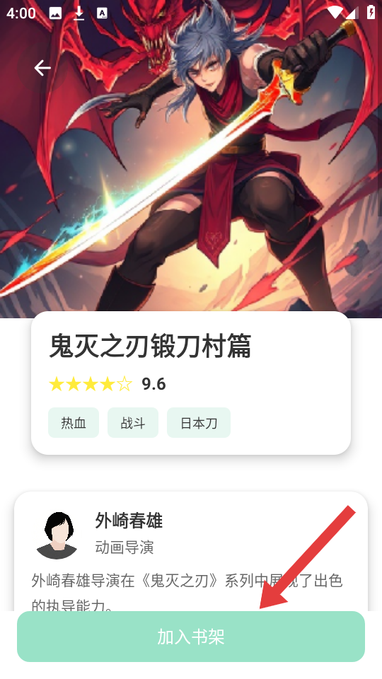 2、选中心仪动漫如【鬼灭之刃锻刀村篇】后,进入详情页,点【加入书架】,方便后续查找。