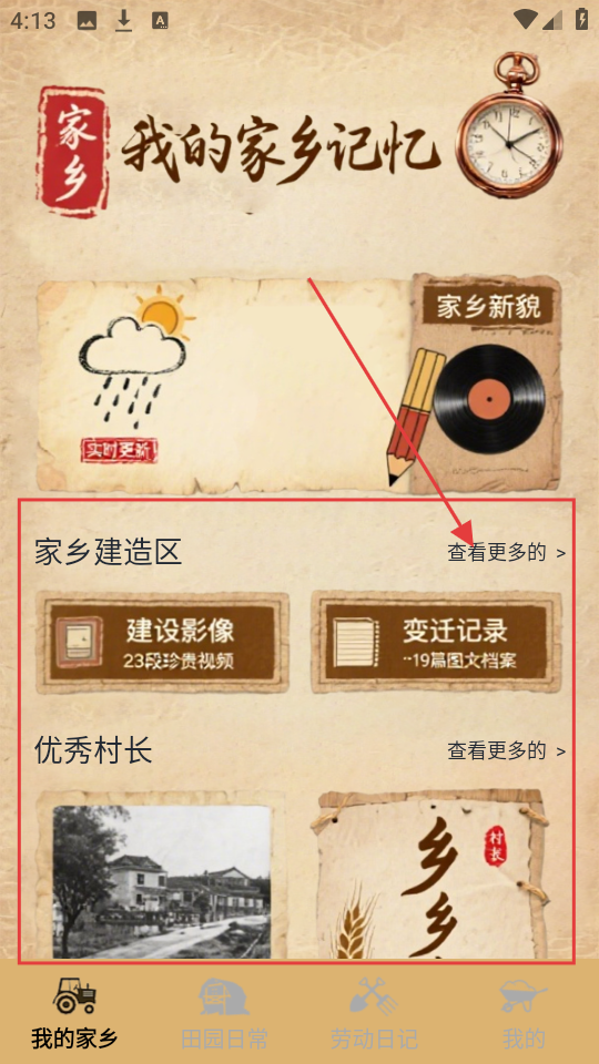1、进入【我的家乡】页,可看家乡建造区、优秀村长等板块,点【查看更多的】,了解家乡相关内容。