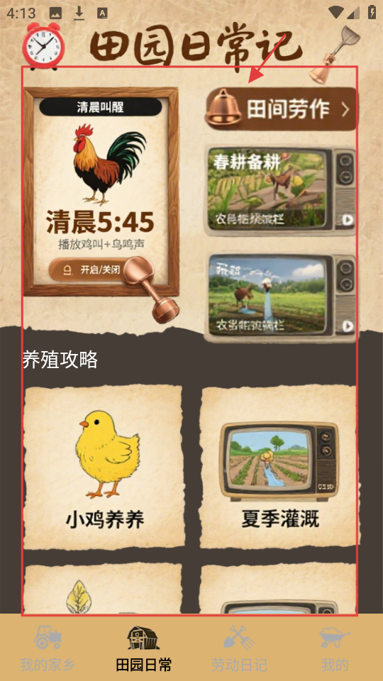 4、切换到【田园日常】页,可设清晨叫醒,也能看田间劳作、养殖攻略等内容,体验田园生活。