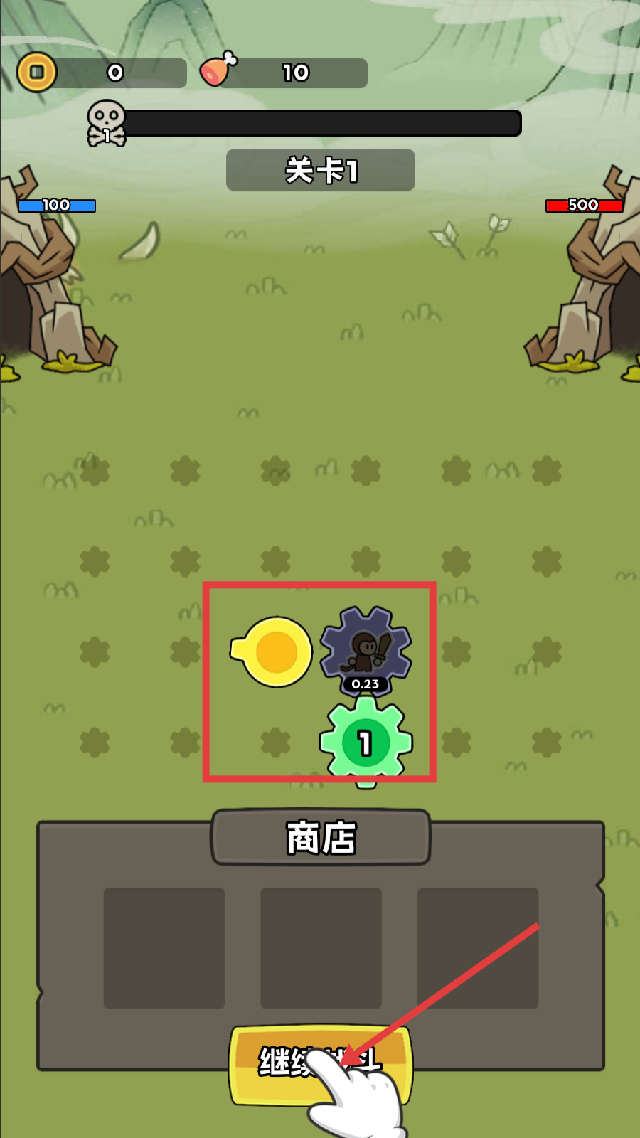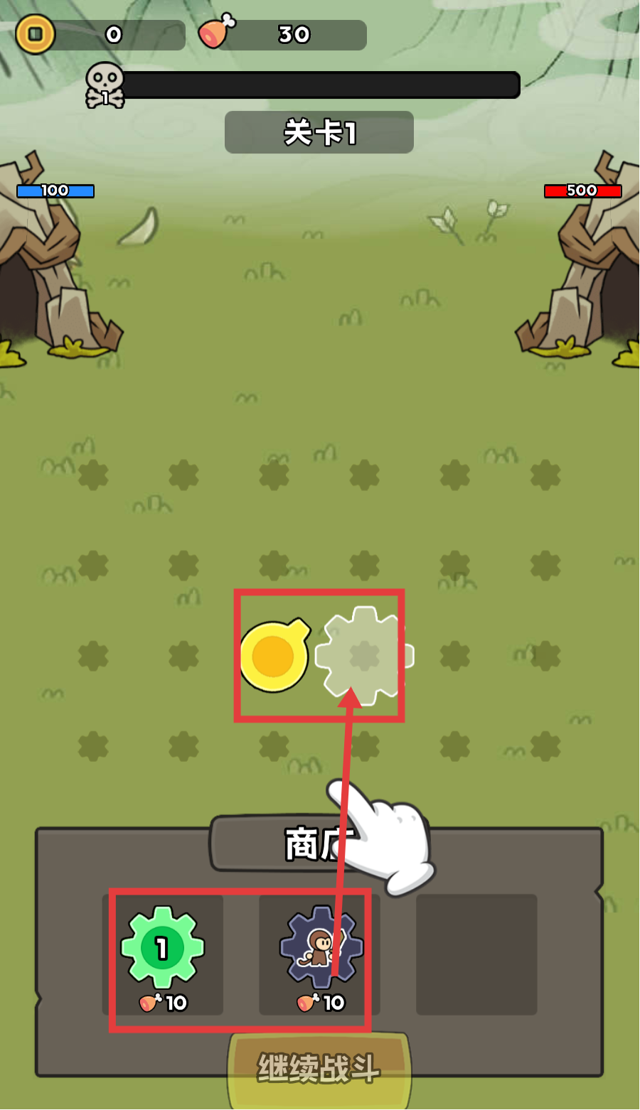 1、在【关卡1】的商店界面,消耗对应资源,选择并拖拽齿轮类道具,为战斗准备增益效果。