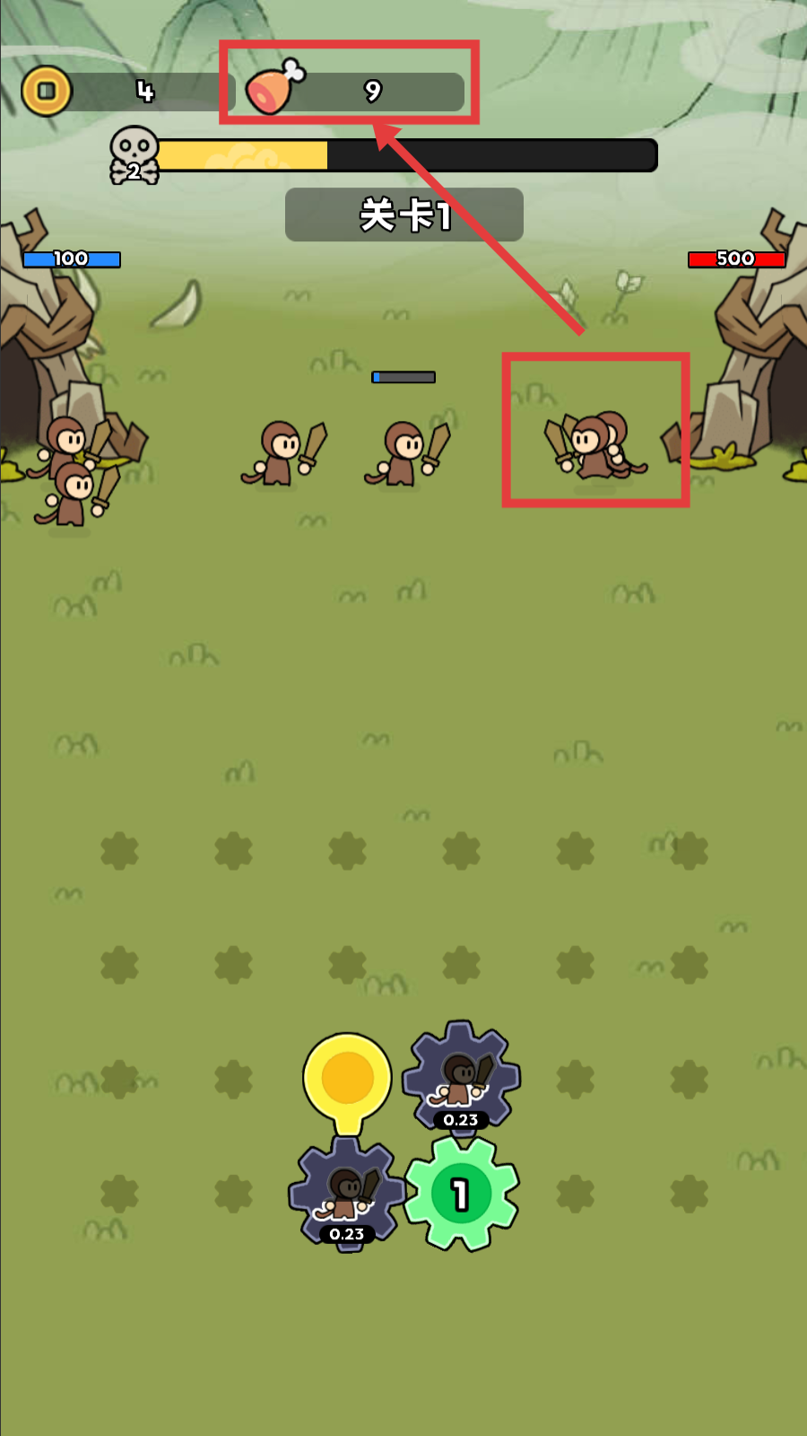 4、战斗过程中,击败敌方单位可获取像鸡腿一样的资源,积累资源能为后续强化单位或购买道具提供支持。