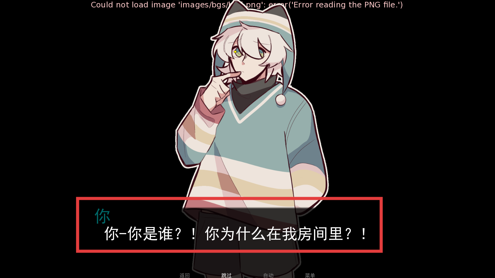 2、进入游戏后,触发角色对话,出现“你-你是谁?!你为什么在我房间里?!”的剧情,推进对话以了解故事背景。