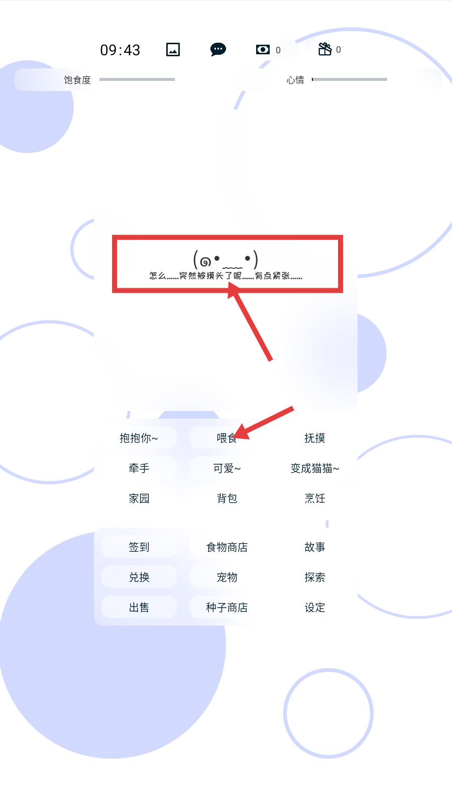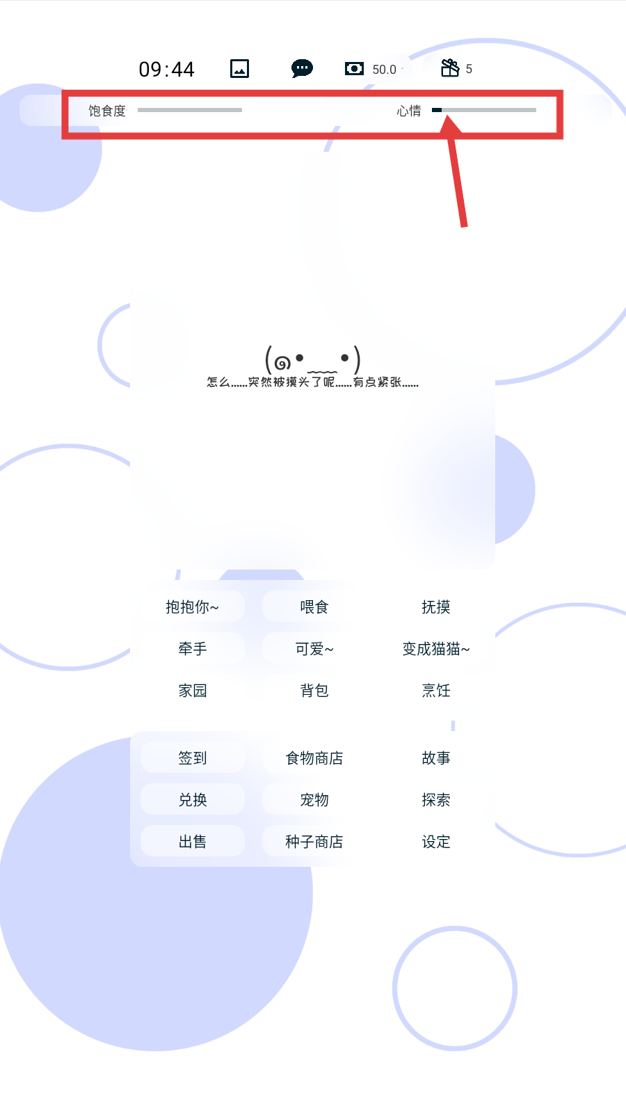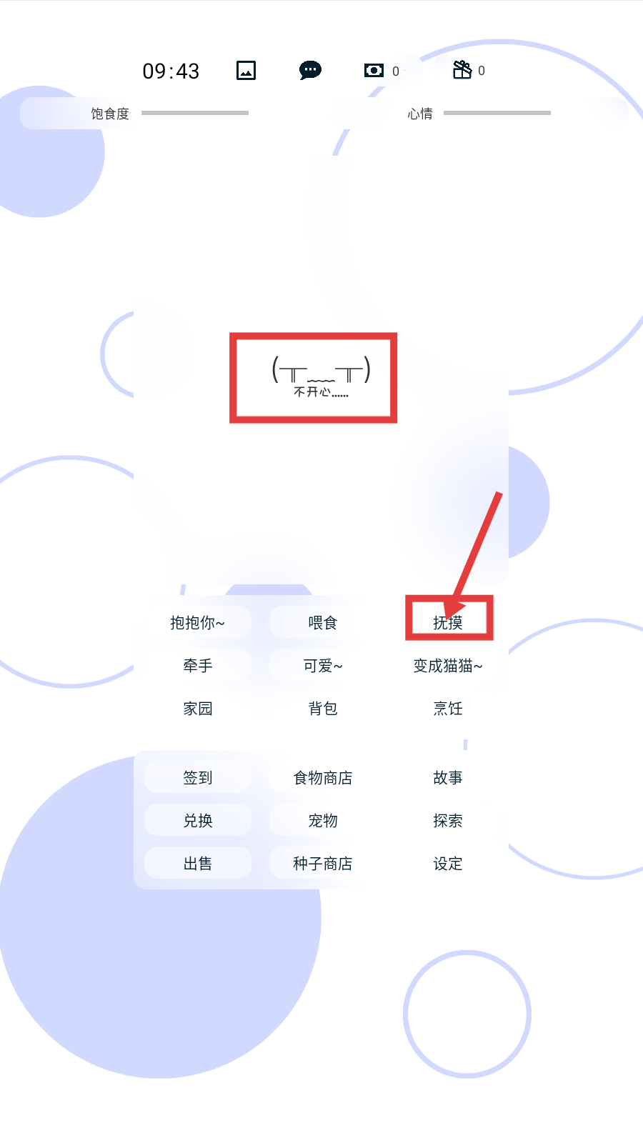 1、当角色显示【(ㅠㅠ)不开心……】时,点击【抚摸】选项,可尝试改善角色心情。