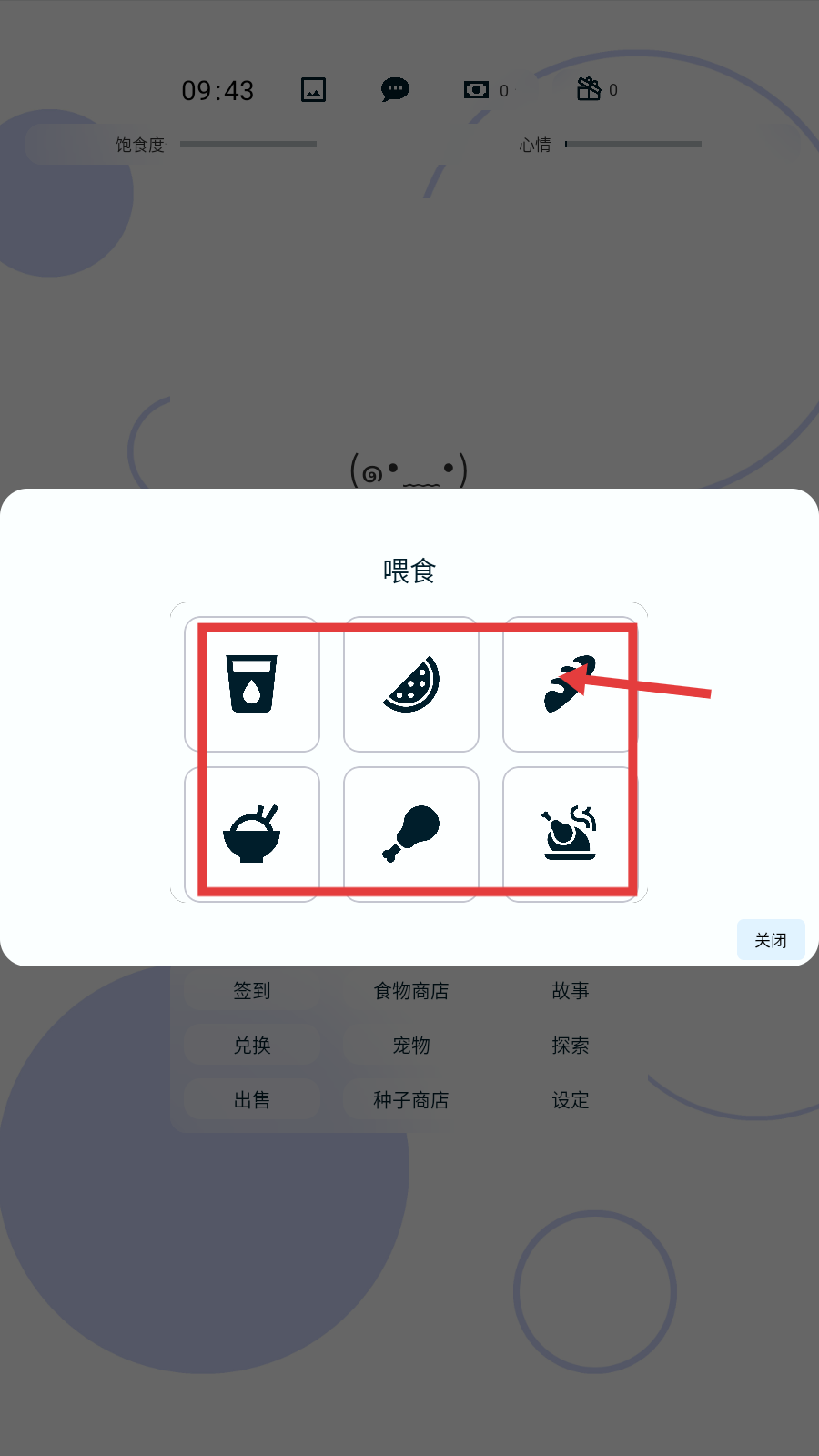 3、在【喂食】界面中,可选择水、披萨、面包等不同食物图标,给角色进行喂食操作。
