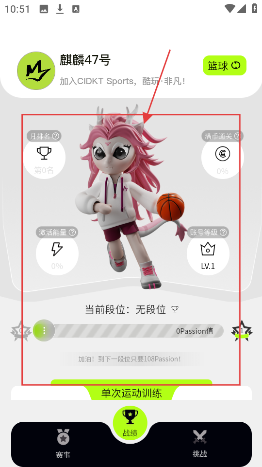 1、查看角色信息,当前无段位,需积累Passion值,点【单次运动训练】,提升等级与各项进度。