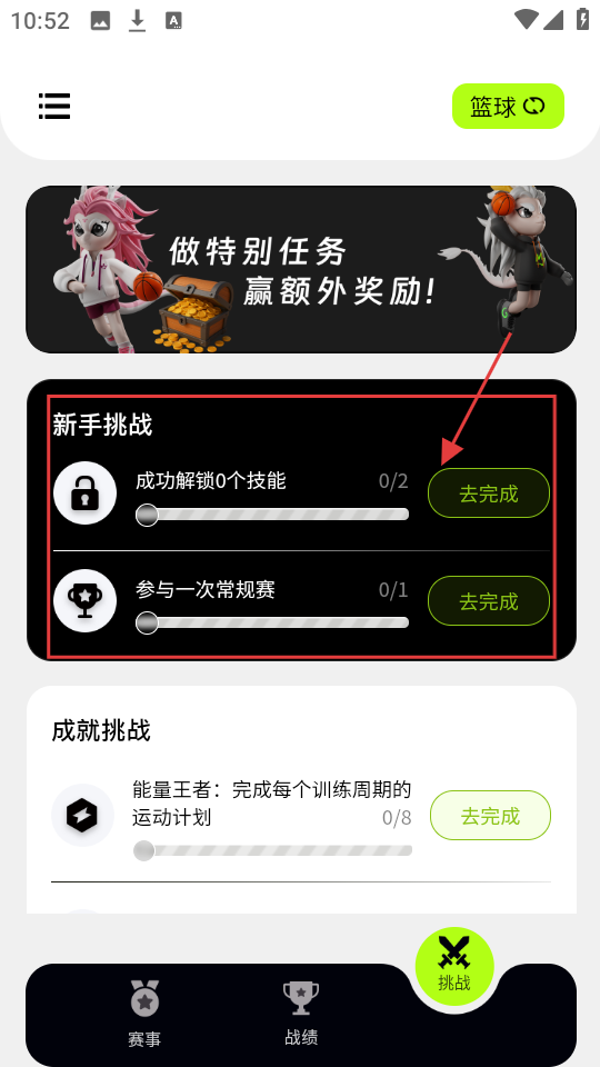 2、进入挑战页,做新手挑战,完成【成功解锁0个技能】【参与一次常规赛】,赢额外奖励。
