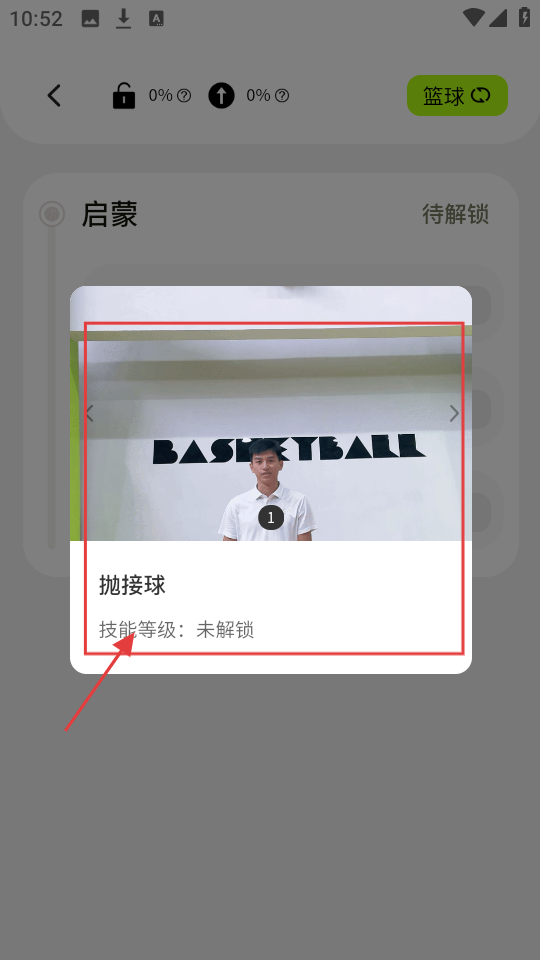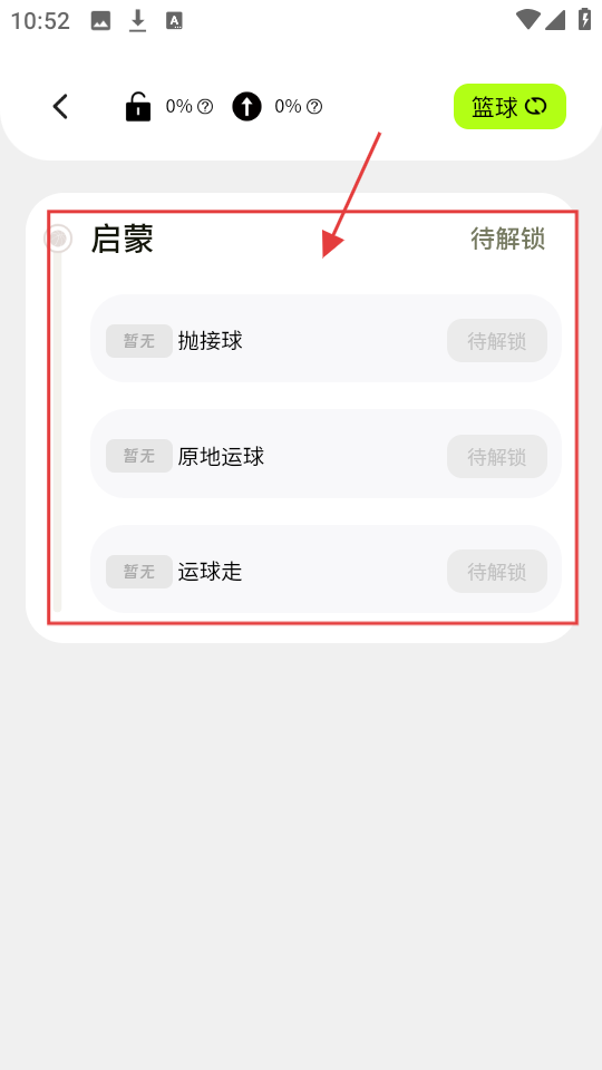 3、进入启蒙技能页,有抛接球、原地运球等技能待解锁,完成任务解锁技能,提升篮球能力。