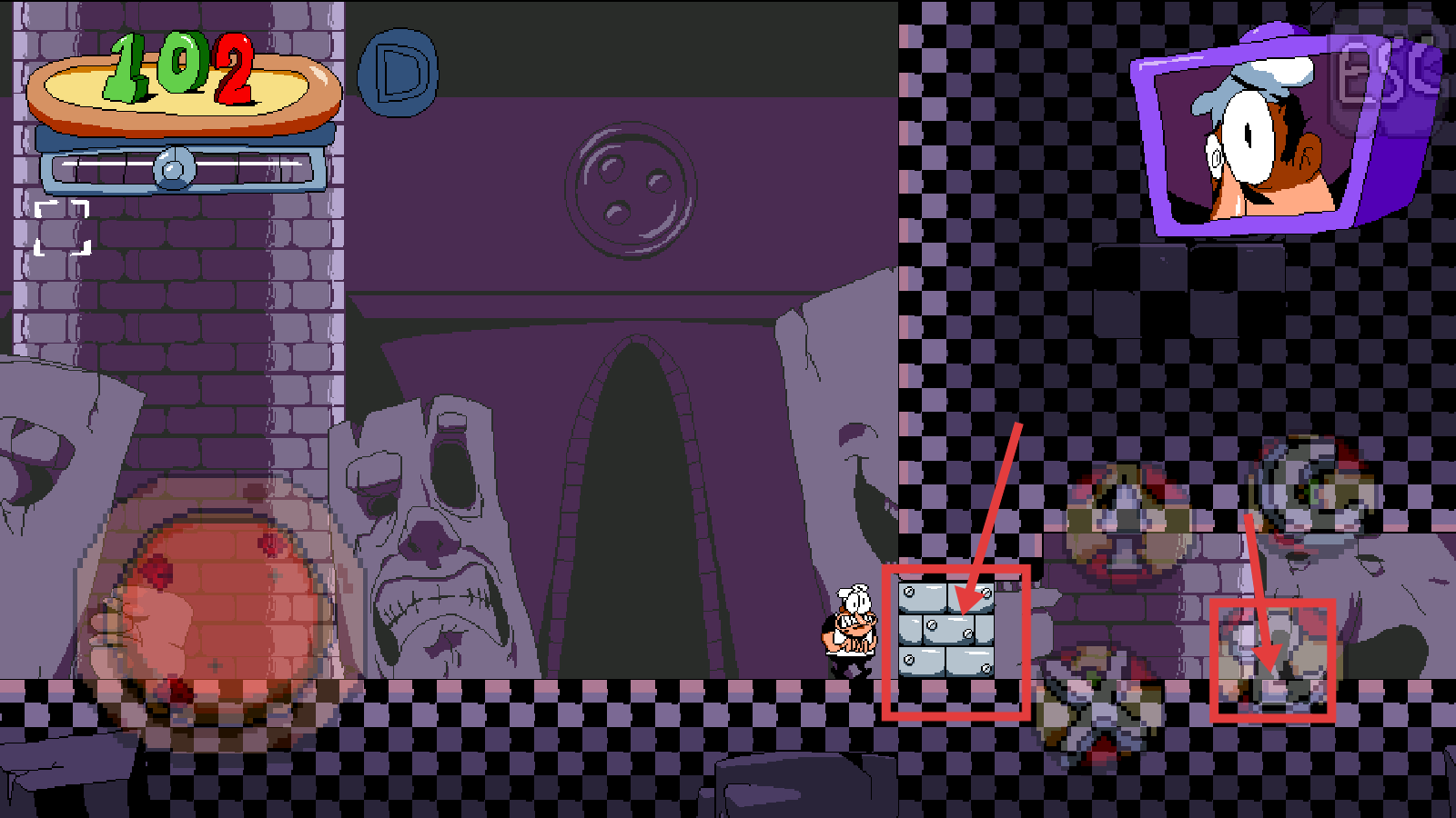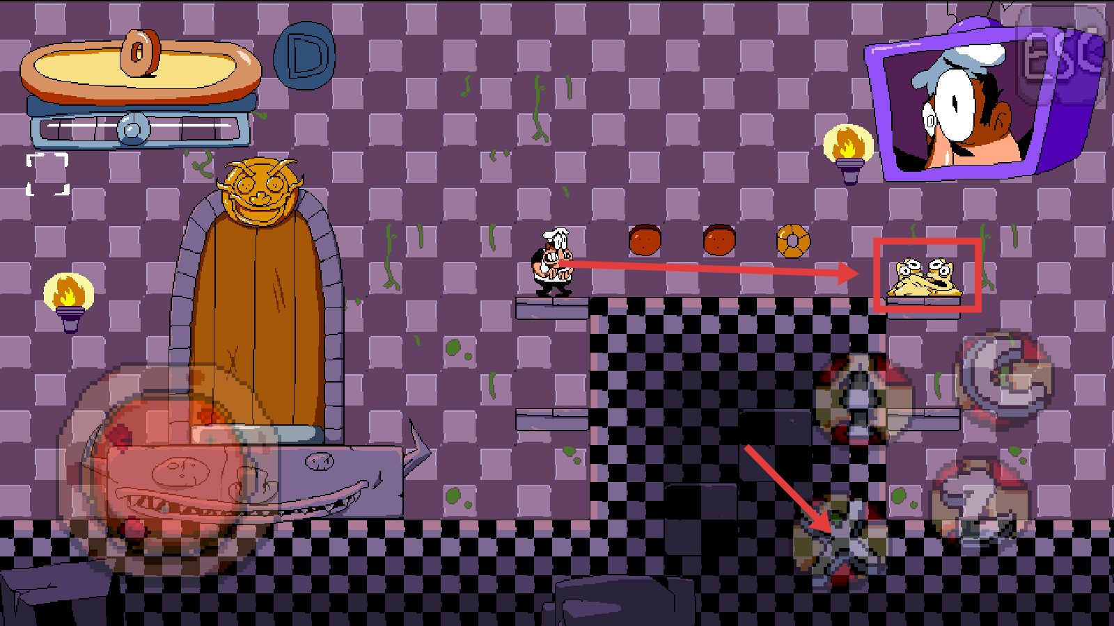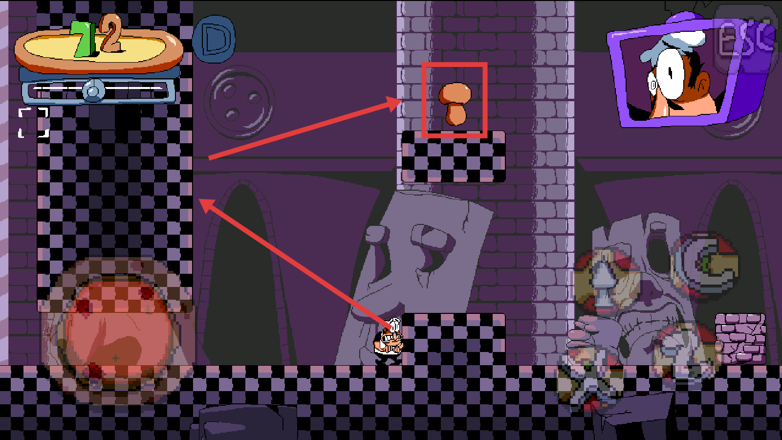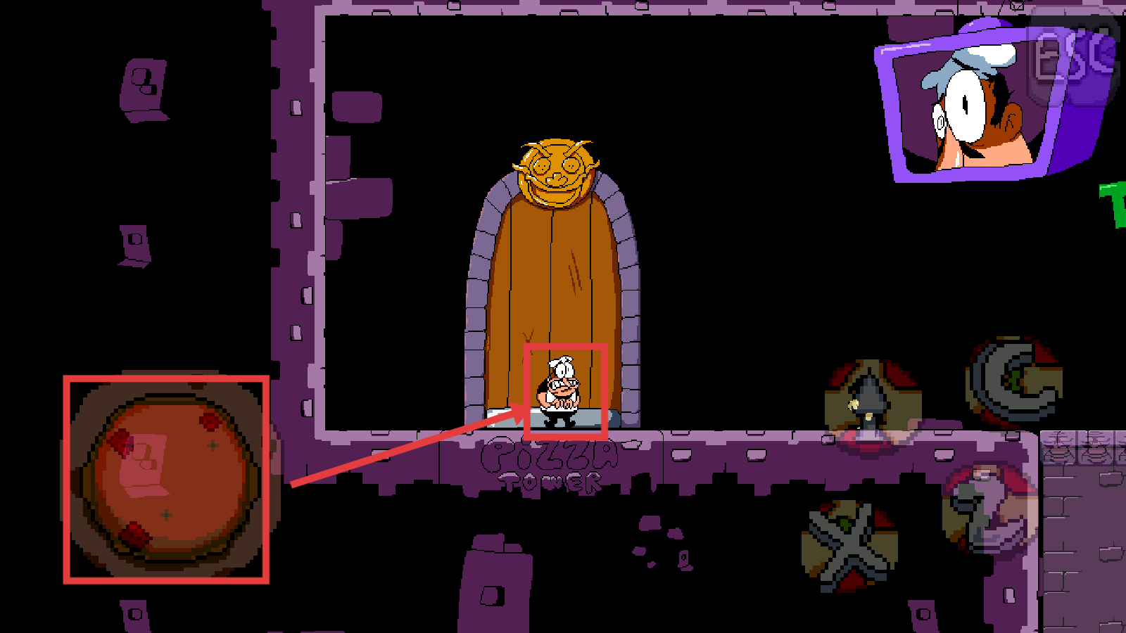 1、进入【PizzaTower】场景后,操控角色靠近大门,同时留意左侧的红色互动区域,为后续探索做准备。