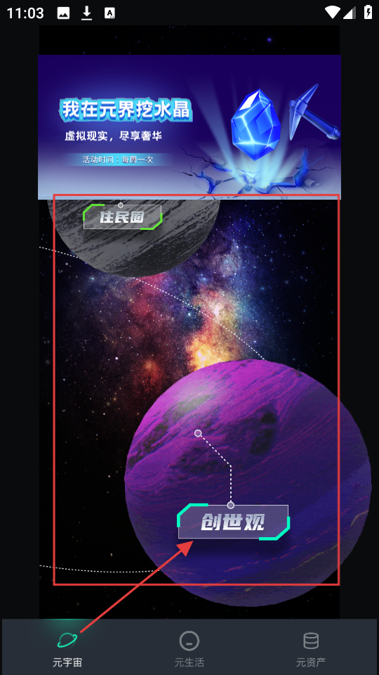 1、进入元宇宙页,参与【我在元界挖水晶】活动,还可查看【创世观】等板块,了解元界相关设定。