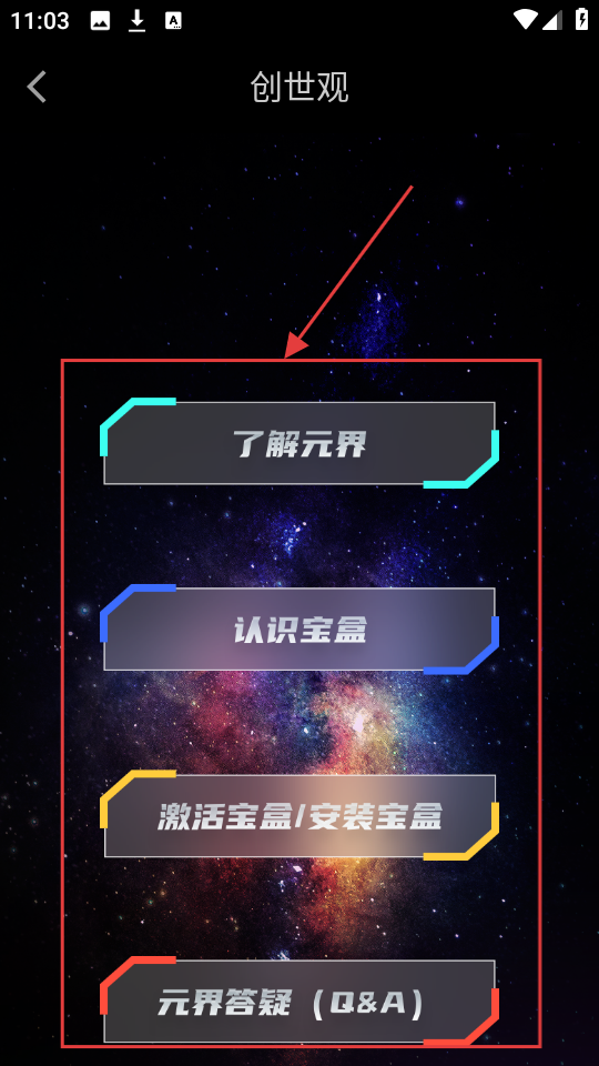 2、进入创世观页,可选【了解元界】【认识宝盒】等选项,逐步了解元界世界与宝盒相关知识。