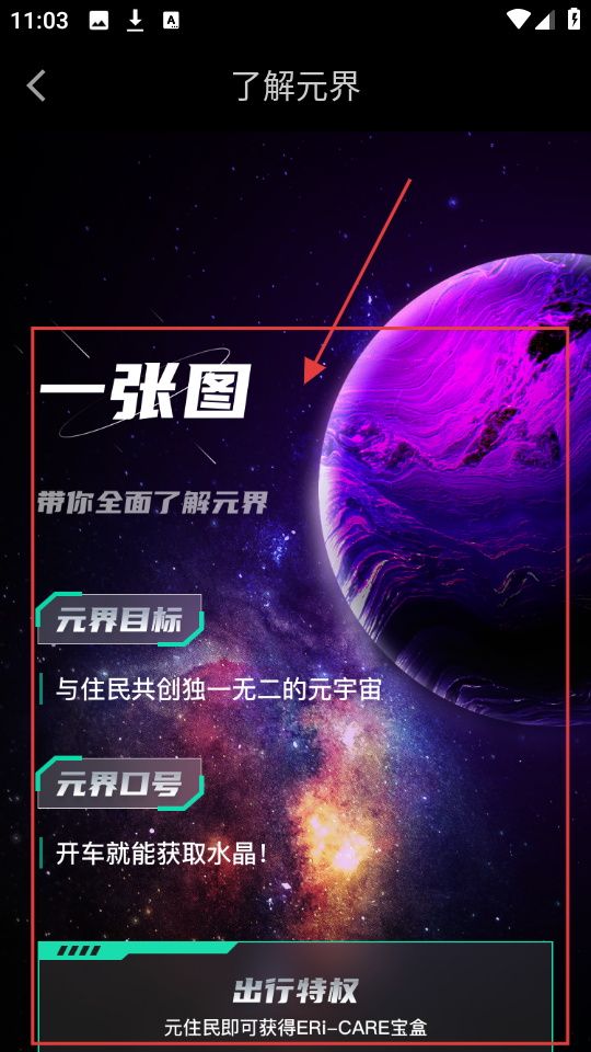 3、进入了解元界页,通过一张图全面了解元界,知晓元界目标、口号,还有出行特权等内容。