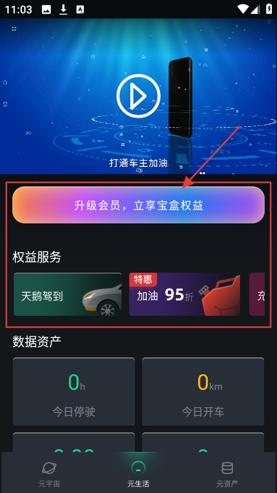 4、进入元生活页,可升级会员立享宝盒权益,还有天鹅驾到、加油95折等权益服务,尽享便利。
