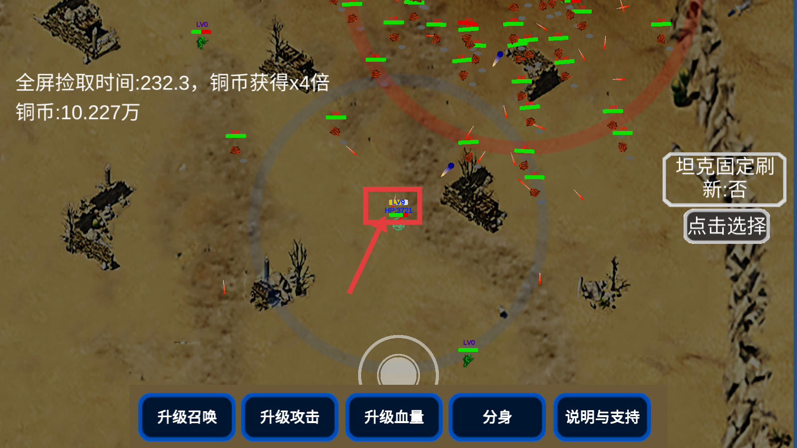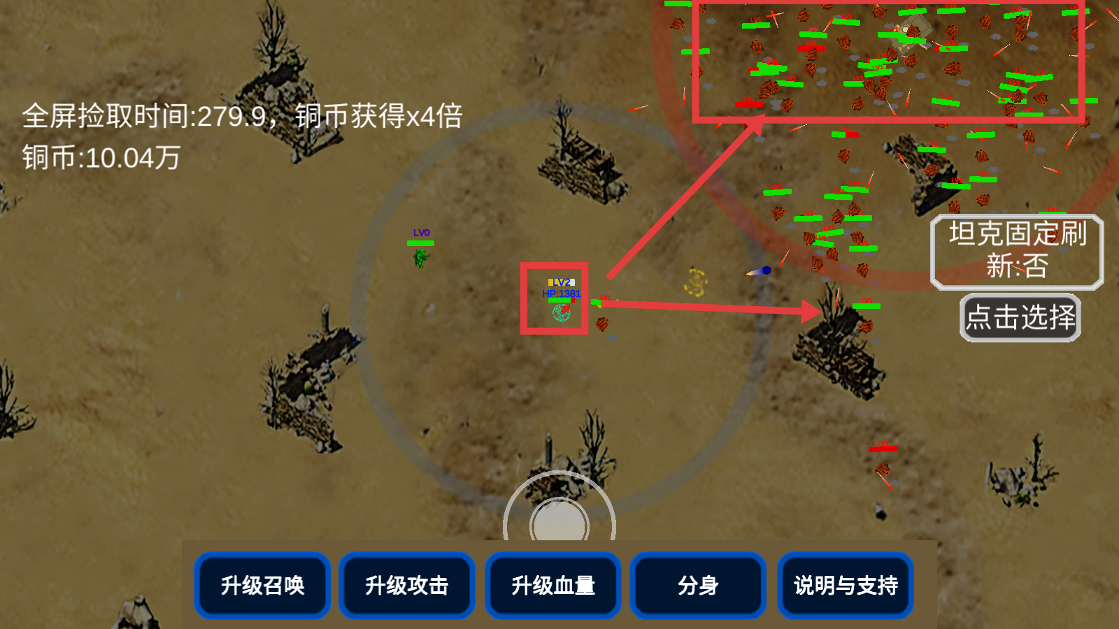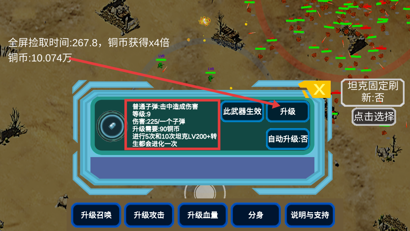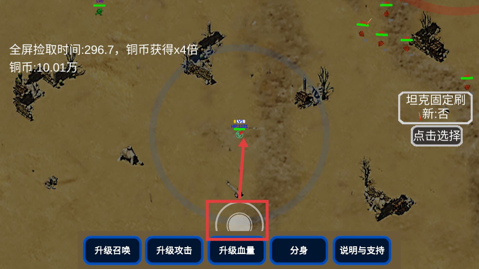 1、战斗时可点击【升级血量】提升生存能力,留意【全屏拾取时间】与【铜币获得x4倍】提示,积累铜币资源。