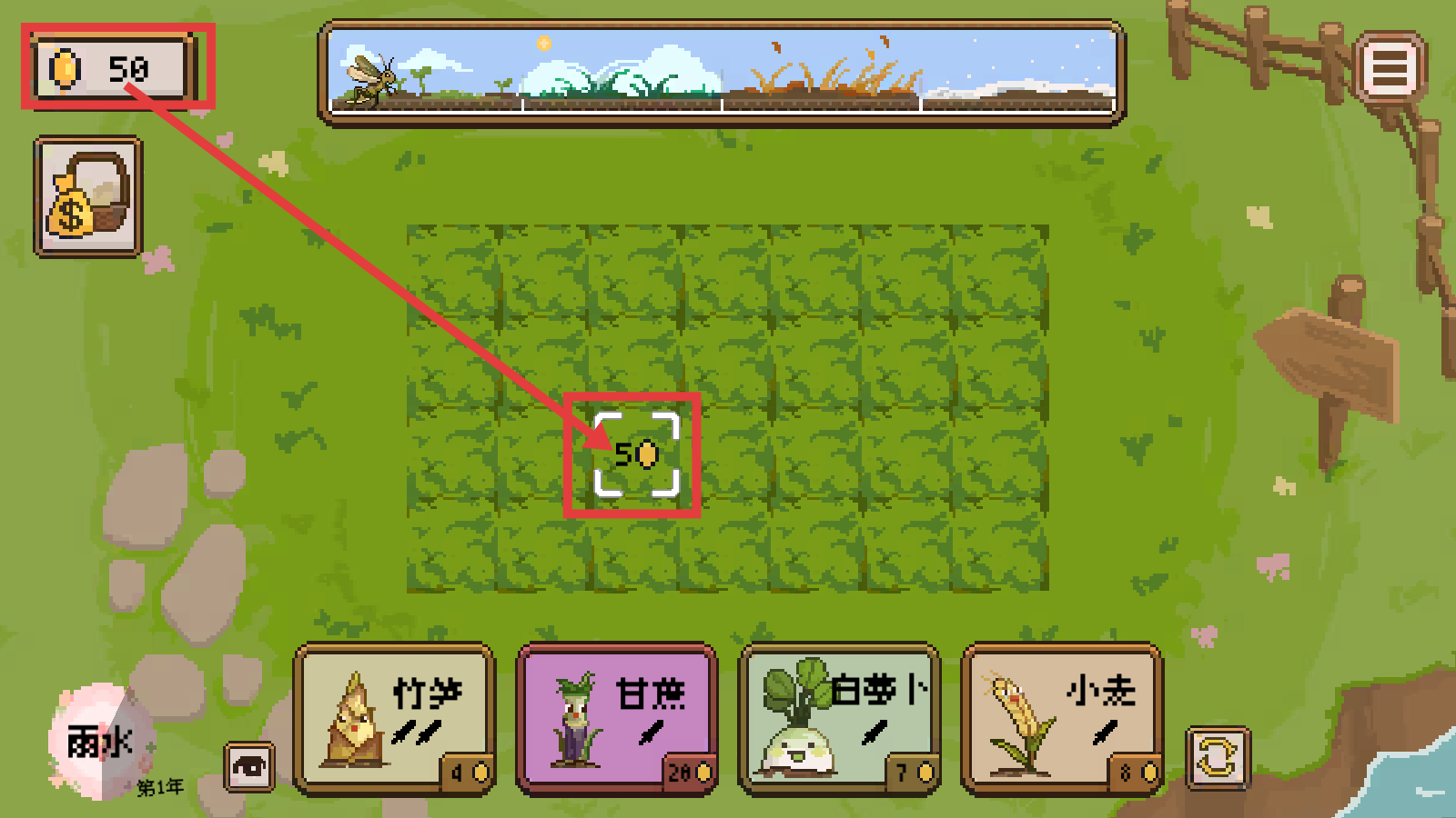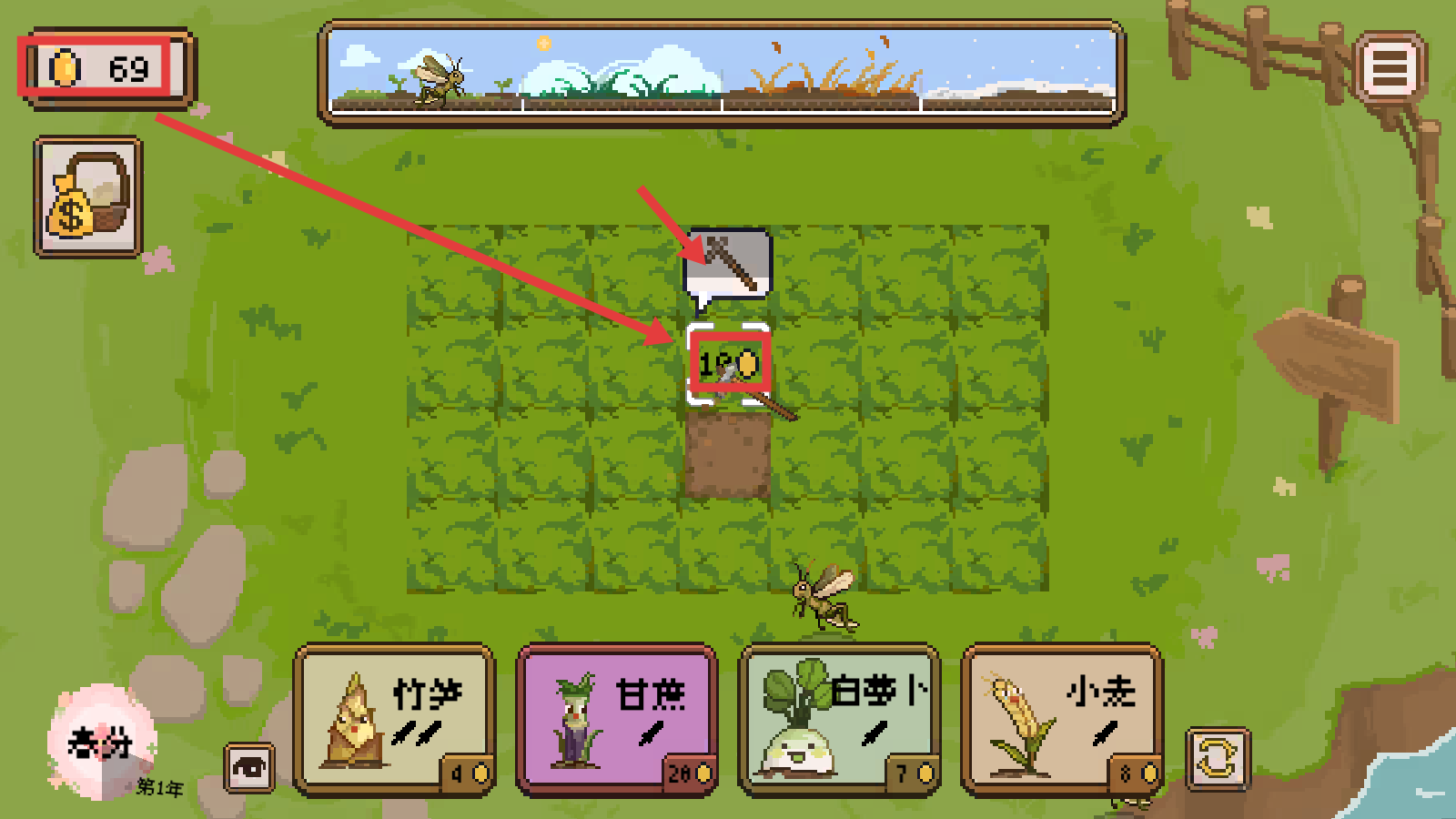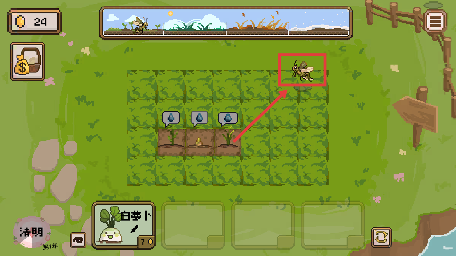 4、作物生长过程中,留意浇水需求(水滴标识),同时要应对场景中出现的昆虫,保障作物正常生长。