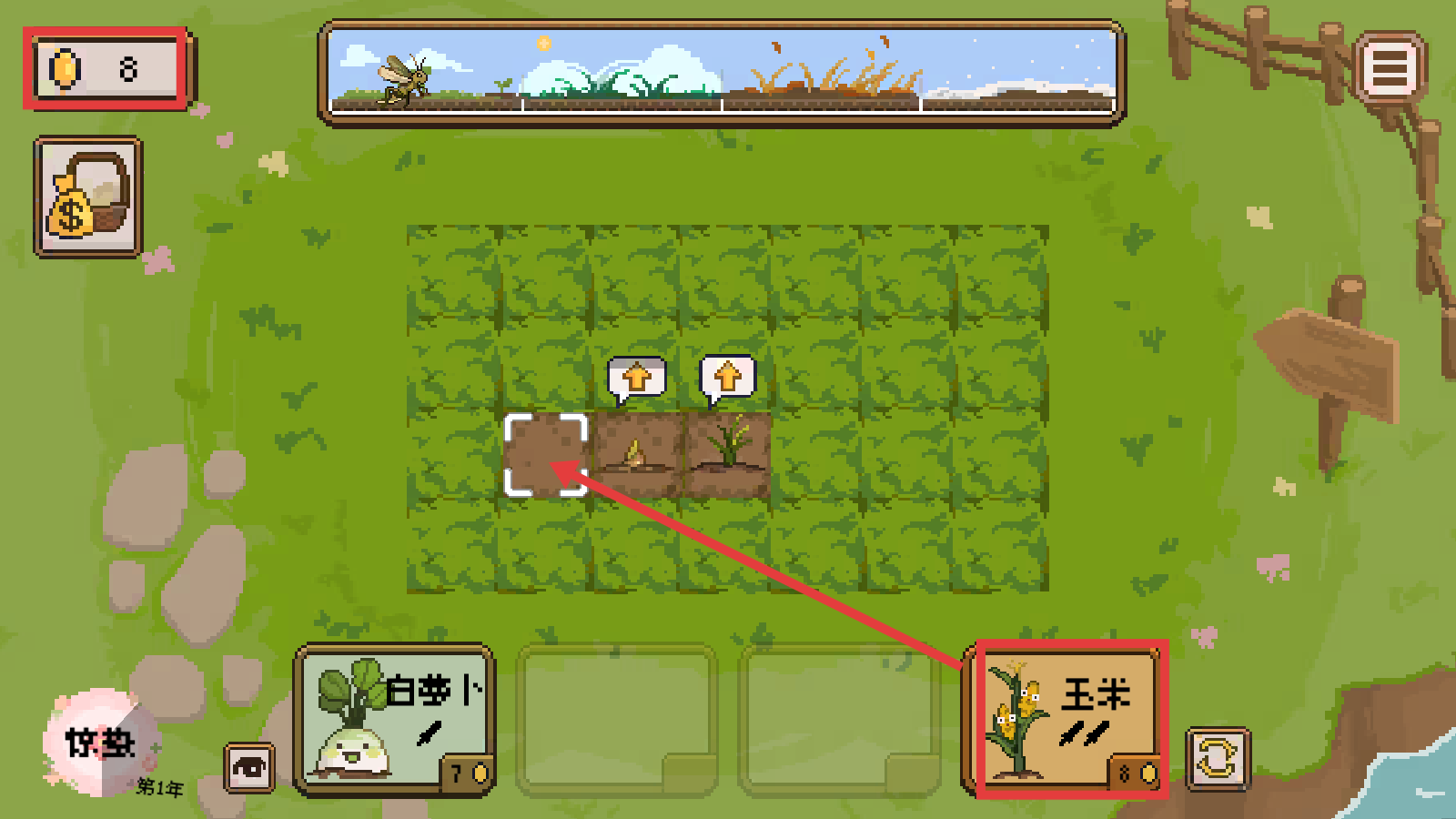 3、消耗金币选择【玉米】种子,种植到开垦的空地块中,推动作物种植进程,发展农场。