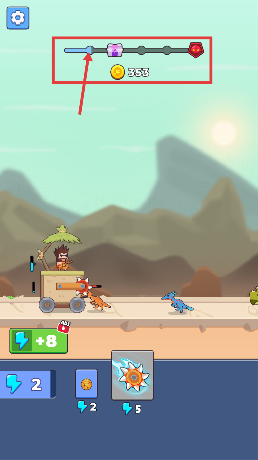 3、利用旋转齿轮等道具攻击岩石、恐龙,能积累更多金币,不过要留意能量(蓝色闪电)的消耗情况。