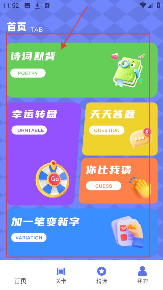 1、进入首页,有【诗词默背】【幸运转盘】等板块,选【诗词默背】,开启诗词学习之旅。