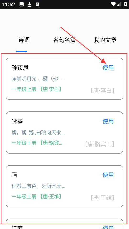 2、进入诗词页,有《静夜思》《咏鹅》等诗词,选要学习的诗词,点【使用】,查看诗词详情。